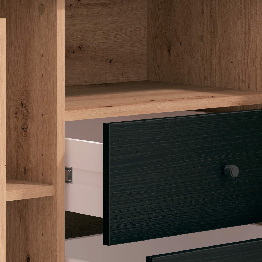 Este móvel resolve dois problemas de uma vez: organização e impacto visual. O efeito ripado nas portas cria ritmo e sofisticação, enquanto o contraste entre o carvalho artesanato e o preto mate dá-lhe um ar contemporâneo e sólido. Os múltiplos nichos permitem organizar equipamentos multimédia, caixas, comandos e objetos decorativos sem confusão. Os pés altos facilitam a limpeza e dão leveza ao conjunto, evitando aquele aspeto pesado típico de móveis TV antigos.