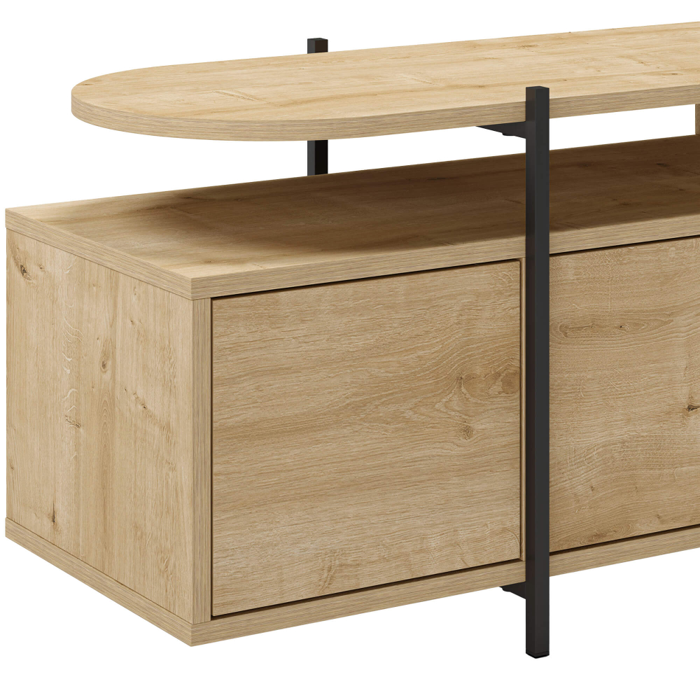 Transforme a sua sala de estar com o moderno e sofisticado móvel TV HINOA. Criado com atenção ao design e funcionalidade, este móvel é fabricado em painel de partículas e revestido em melamina de alta qualidade, proporcionando durabilidade e uma aparência contemporânea. Com um sistema de portas empurrar para abrir e fecho suave, o HINOA combina estética minimalista com uma utilização prática e silenciosa. Os pés metálicos de 6,5 cm de altura conferem uma estrutura robusta e um toque industrial ao design.