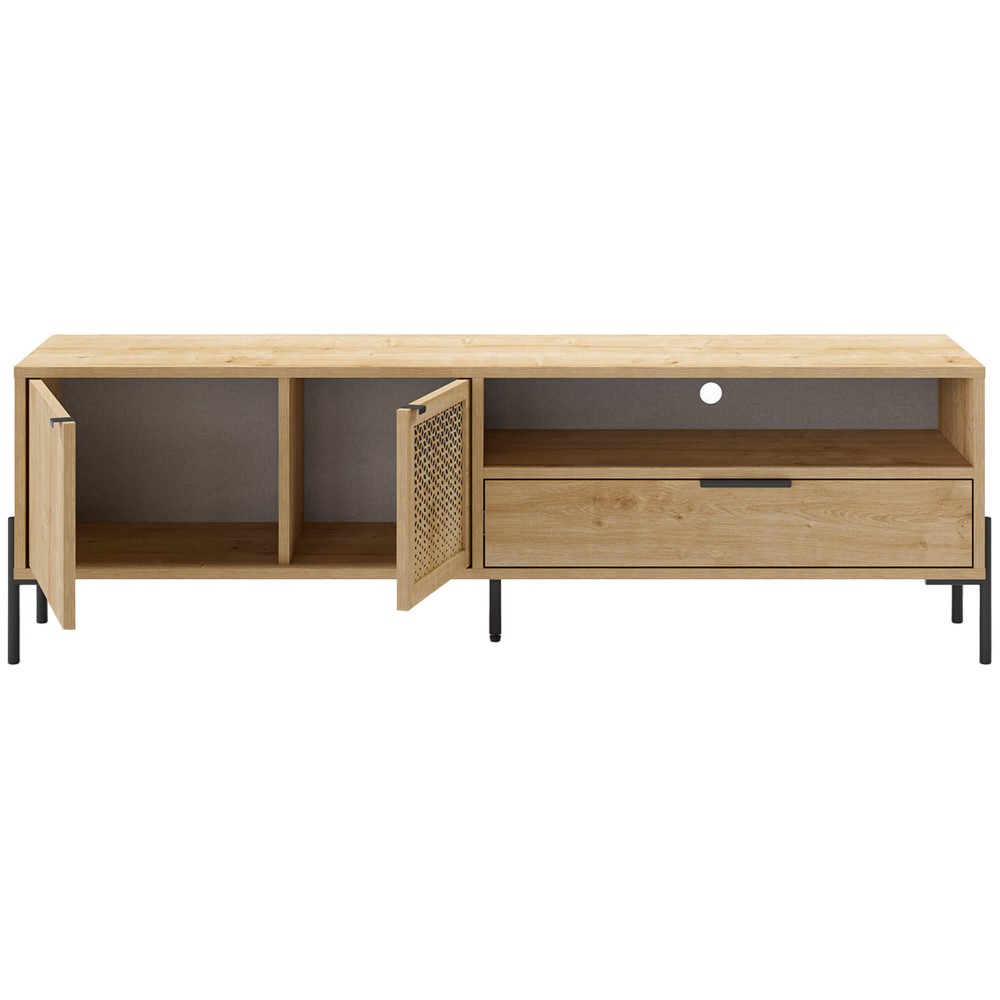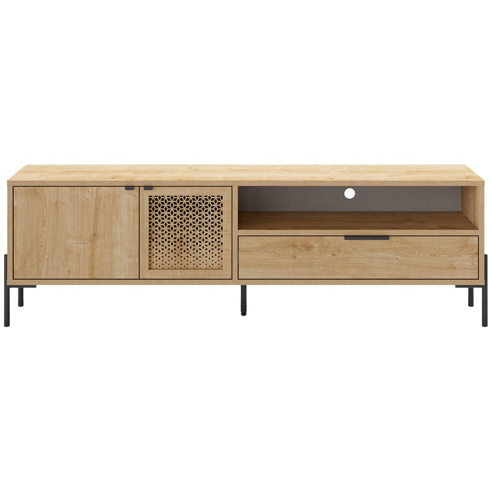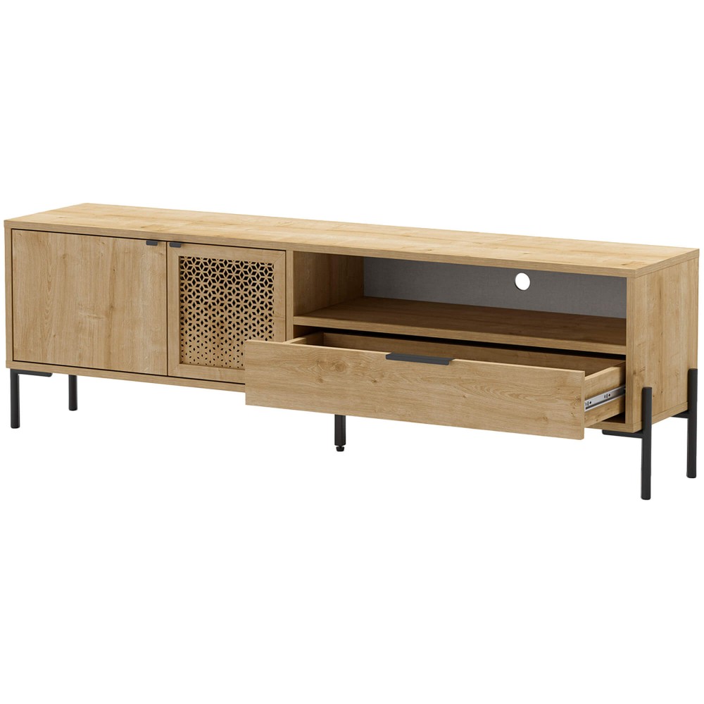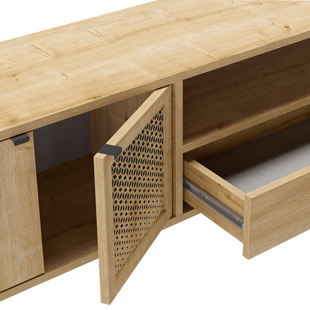 Este móvel TV destaca-se pelo equilíbrio entre funcionalidade e carácter. O corte a laser cria um ponto focal decorativo sem excessos, enquanto os nichos facilitam o acesso a equipamentos multimédia. A gaveta permite manter acessórios organizados e fora de vista. Os pés metálicos elevam o conjunto, facilitando a limpeza e reforçando a estética contemporânea.