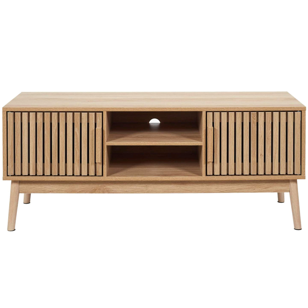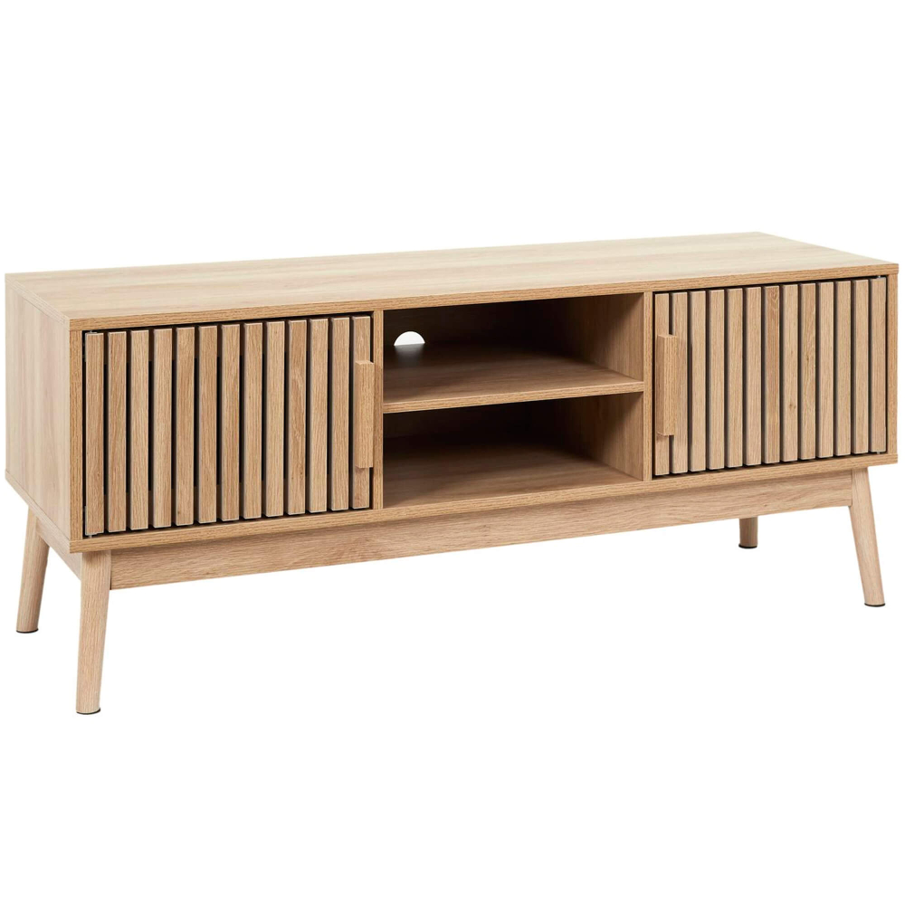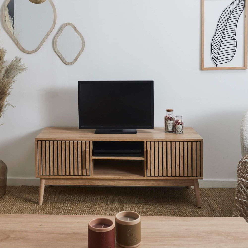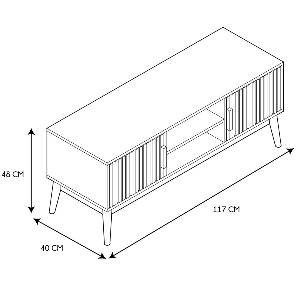 O móvel TV KLAUS é uma peça essencial para quem valoriza funcionalidade, design minimalista e um toque natural no ambiente da sala. Construído com materiais de alta qualidade e um acabamento ripado elegante, este móvel destaca-se como a peça central perfeita para qualquer sala de estar contemporânea. As duas portas laterais apresentam um design ripado moderno, criando um visual sofisticado e único. Inclui uma prateleira central ideal para dispositivos eletrónicos como consolas, leitores de DVD ou boxes de TV. Possui, ainda, uma furação discreta no fundo que permite a passagem de cabos, mantendo o espaço limpo e organizado.