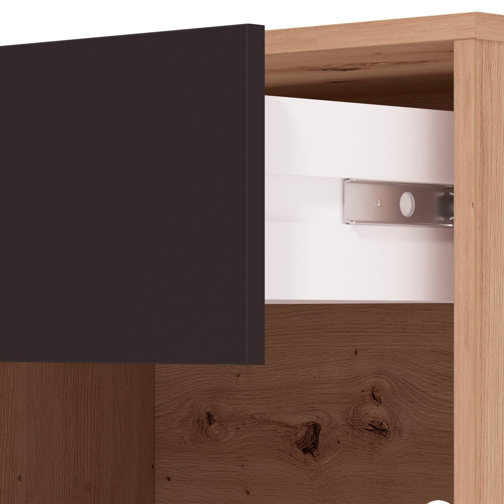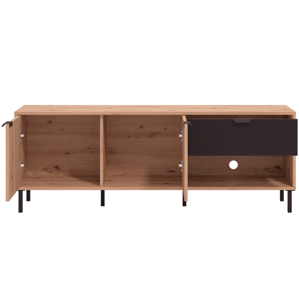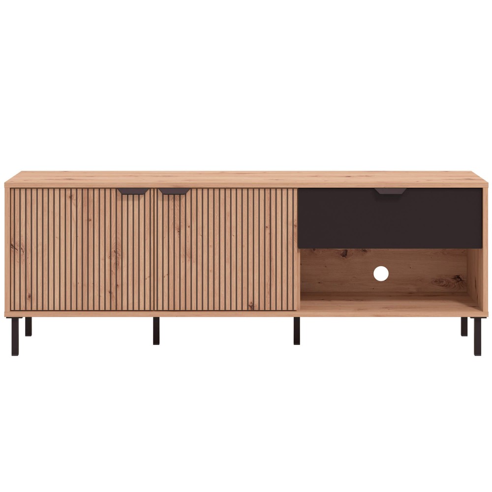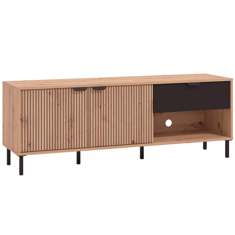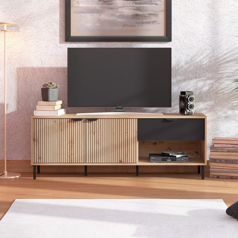 Pensado para o uso diário, este móvel combina duas portas de bater com uma gaveta funcional e uma prateleira interior, permitindo arrumar equipamentos, comandos e acessórios de forma prática e intuitiva. Os puxadores e pés em metal introduzem um contraste moderno e garantem estabilidade, elevando o móvel do chão e tornando o ambiente mais leve e atual.