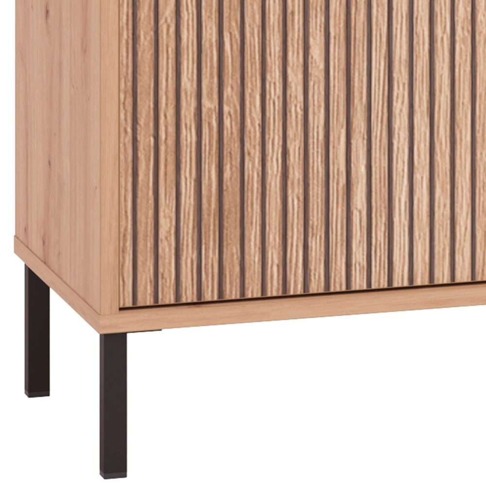 O Móvel TV MAYENNE com 2 portas e 1 gaveta é a escolha certa para quem quer uma sala organizada sem abdicar de personalidade. O padrão ripado em impressão 2D cria profundidade visual e dá imediatamente um ar contemporâneo e sofisticado ao espaço, enquanto o acabamento mate reforça a elegância discreta do conjunto.