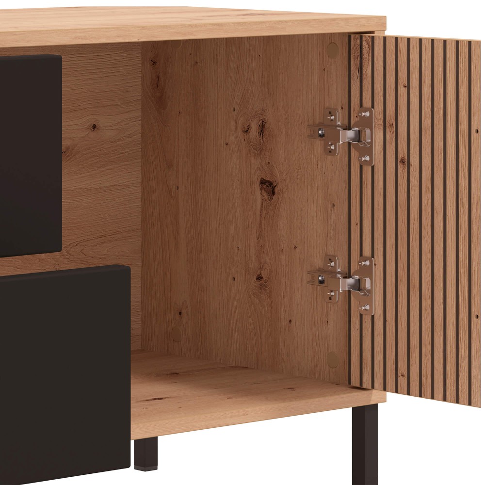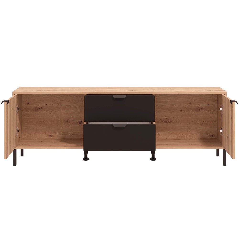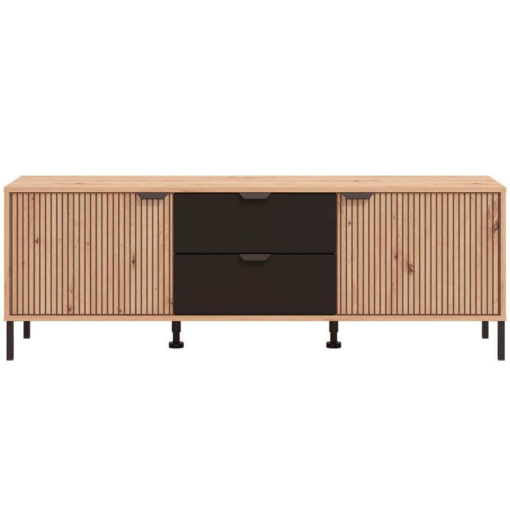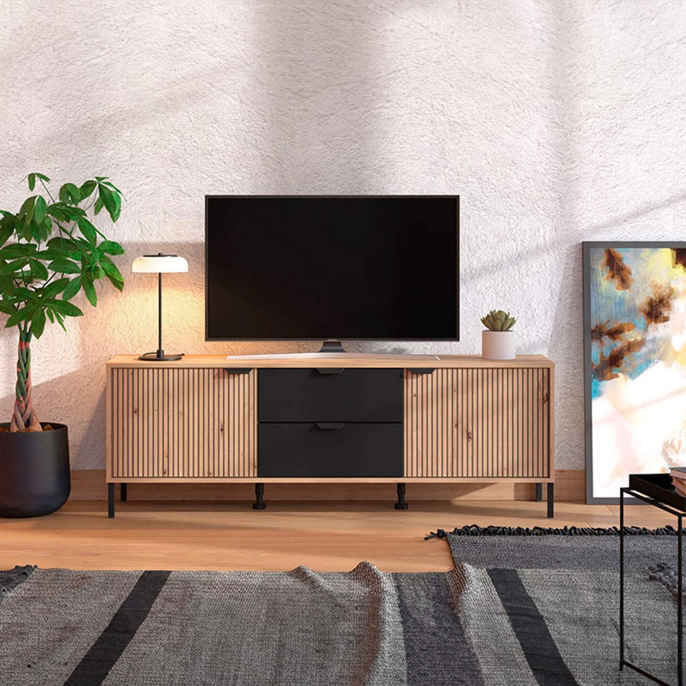 Móvel TV MAYENNE com 2 portas e 2 gavetas combina design ripado moderno e arrumação funcional.