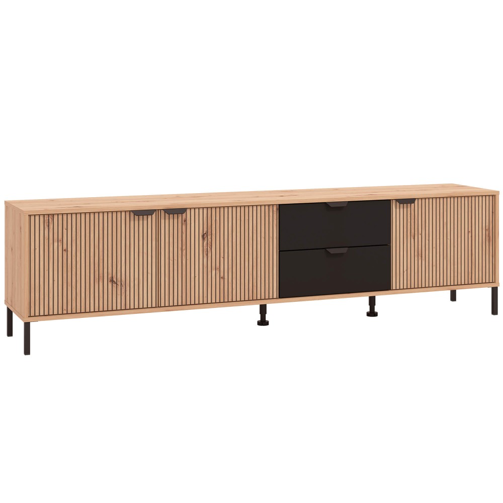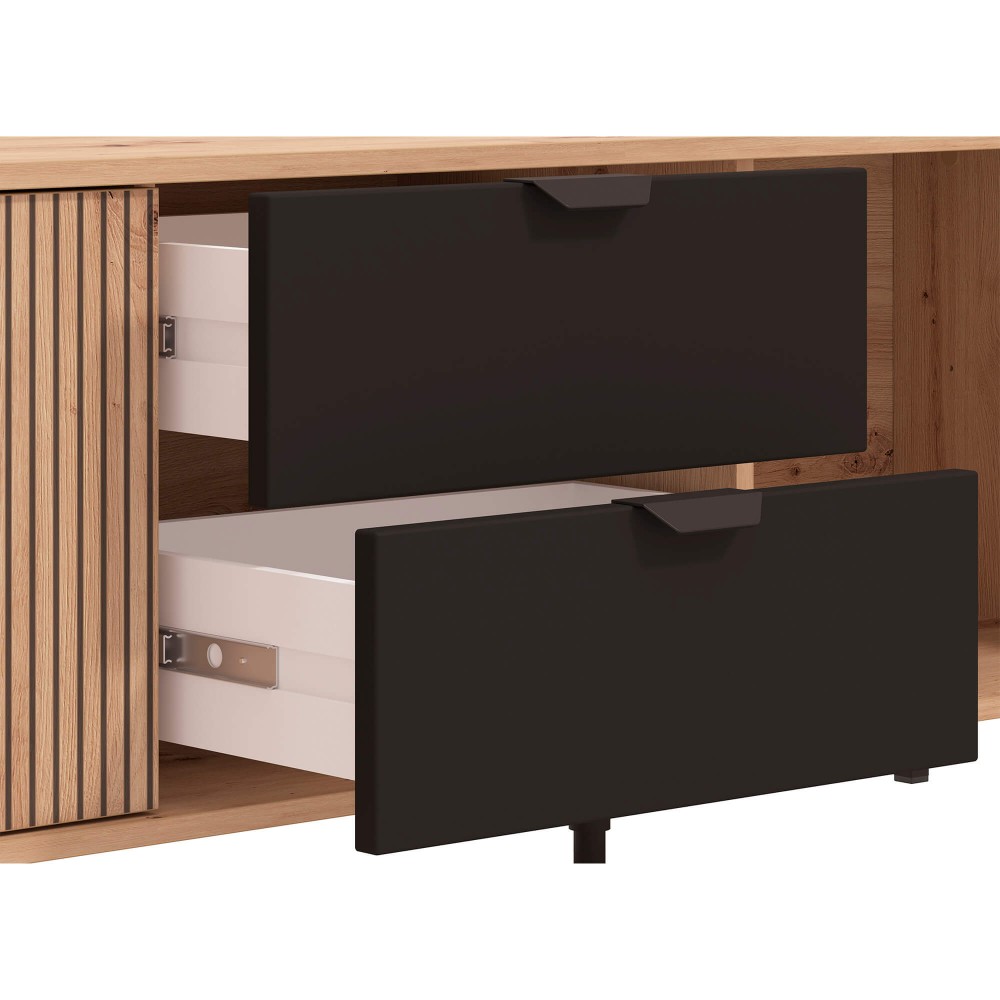 Este móvel destaca-se pela capacidade de arrumação bem distribuída: as três portas de bater escondem volumes maiores, enquanto as duas gavetas facilitam o acesso rápido a comandos, cabos ou acessórios. Os puxadores em metal acrescentam um contraste moderno e os pés metálicos elevam o conjunto, dando leveza visual e facilitando a limpeza do espaço.