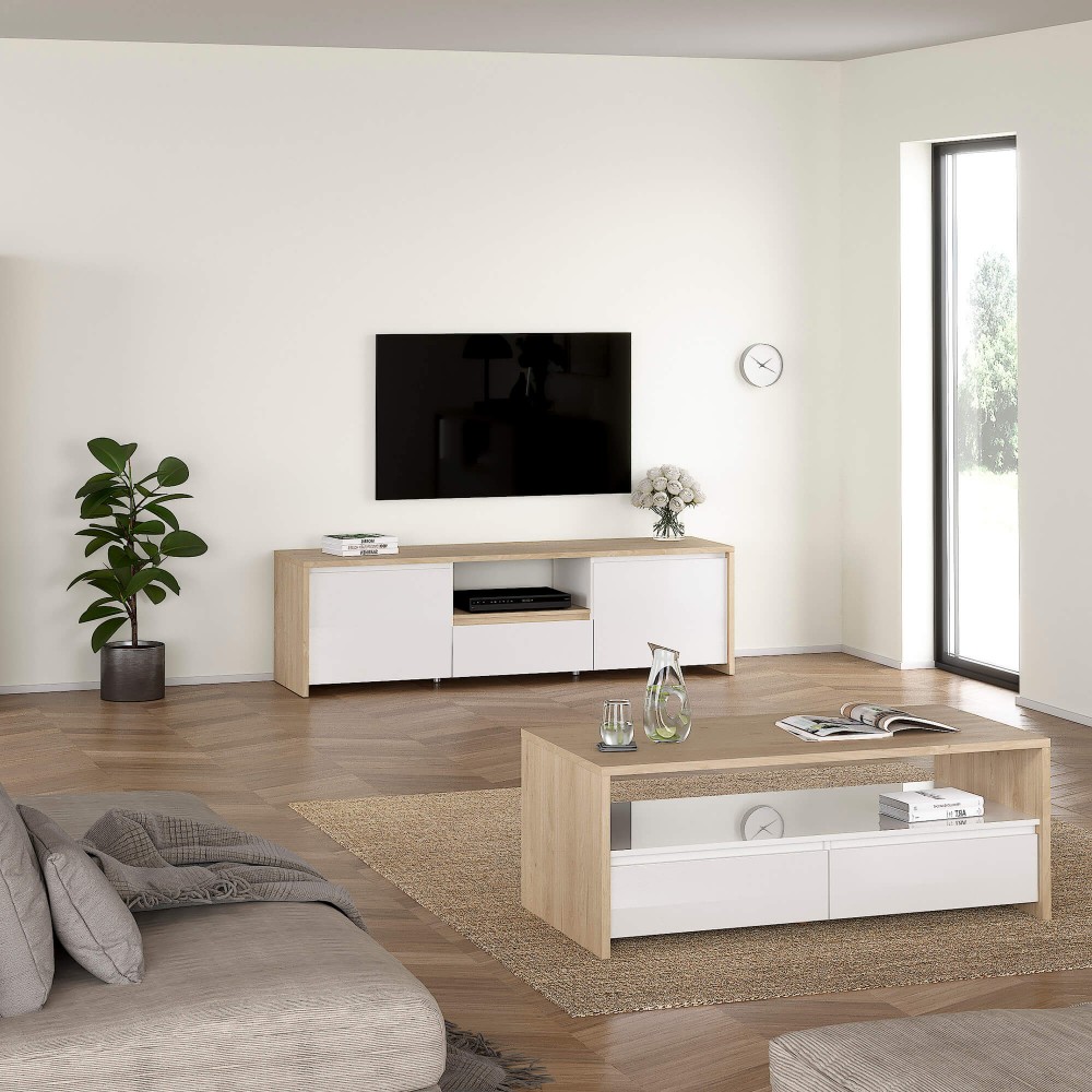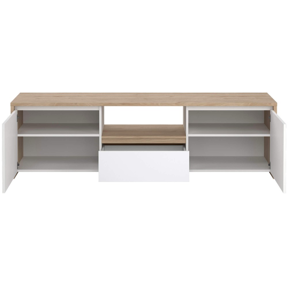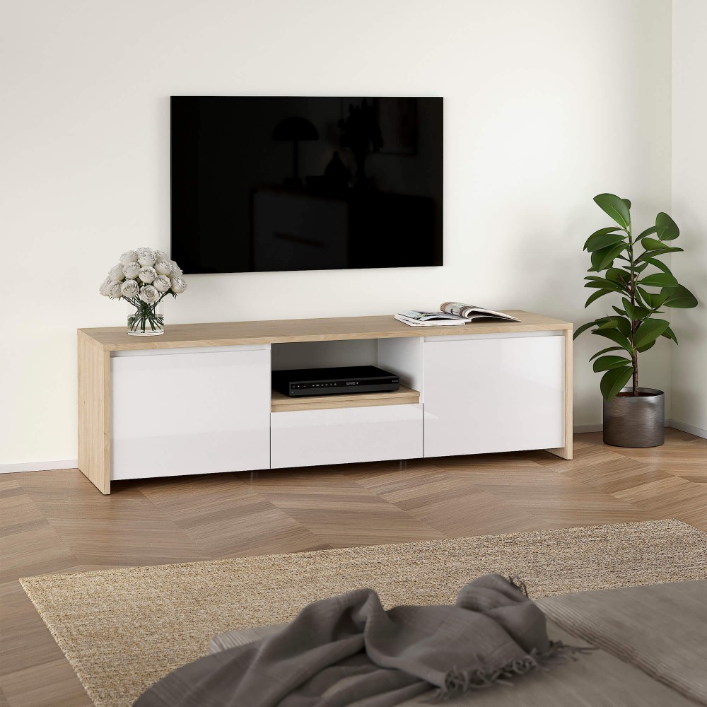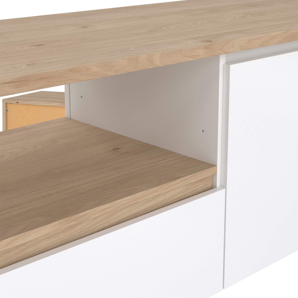 A conjugação entre branco mate e estrutura em tom claro confere-lhe um visual leve e moderno, ideal para ambientes minimalistas ou escandinavos. O nicho central é perfeito para equipamentos multimédia e permite manter cabos organizados e fora de vista.