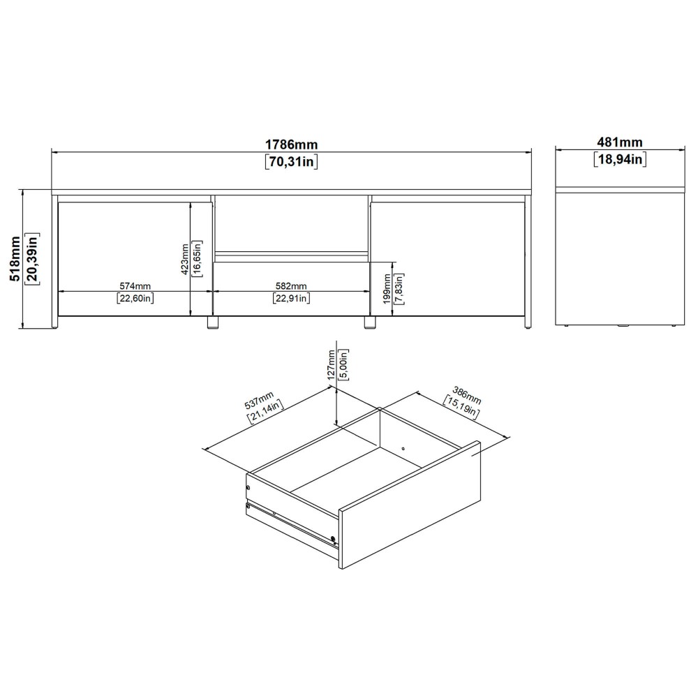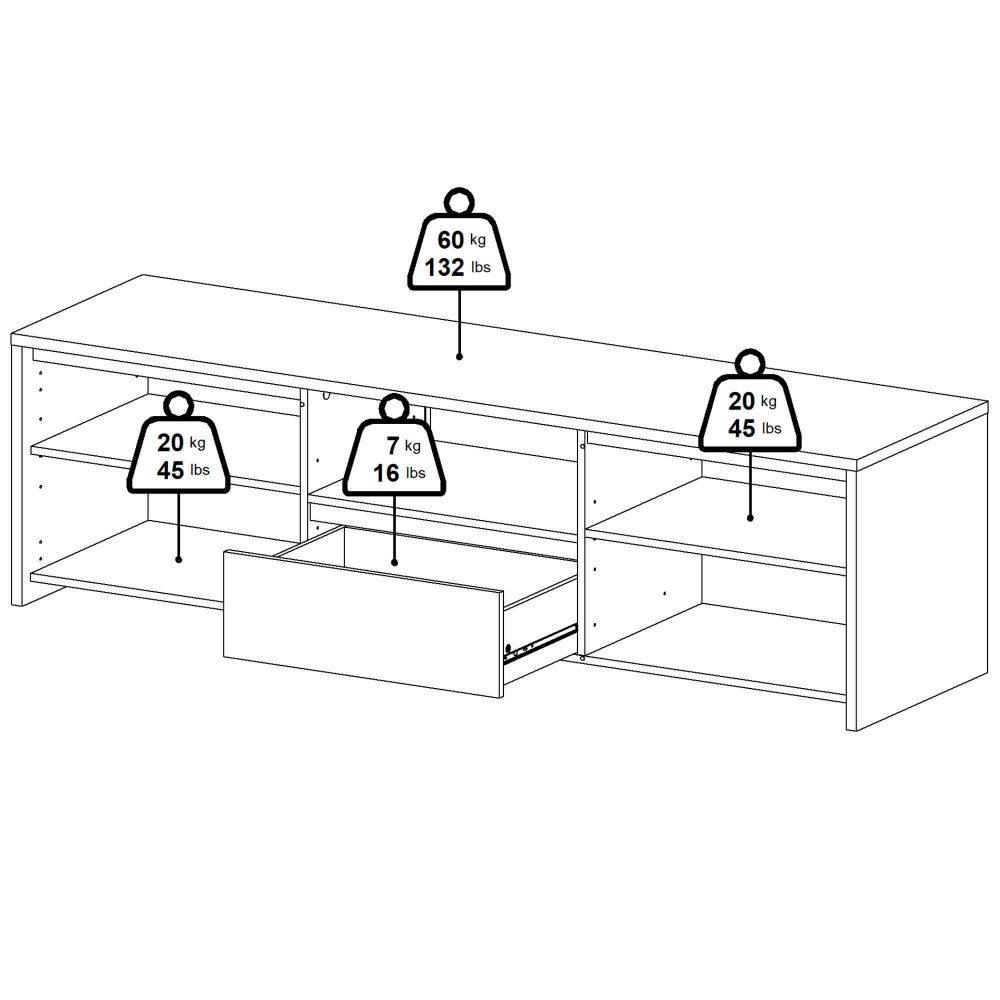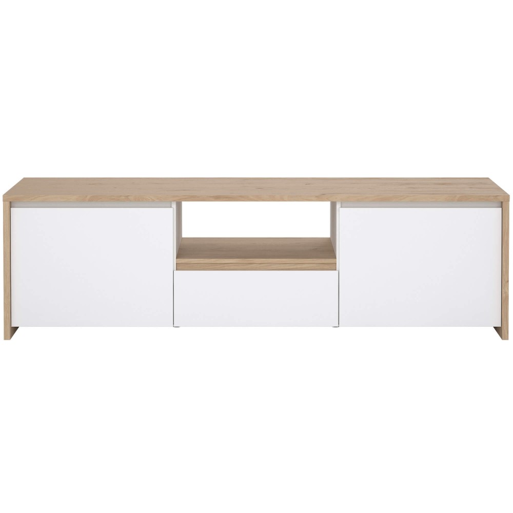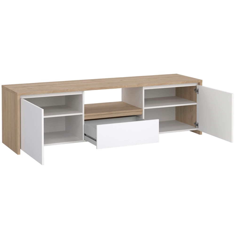 A conjugação entre branco mate e estrutura em tom claro confere-lhe um visual leve e moderno, ideal para ambientes minimalistas ou escandinavos. O nicho central é perfeito para equipamentos multimédia e permite manter cabos organizados e fora de vista.