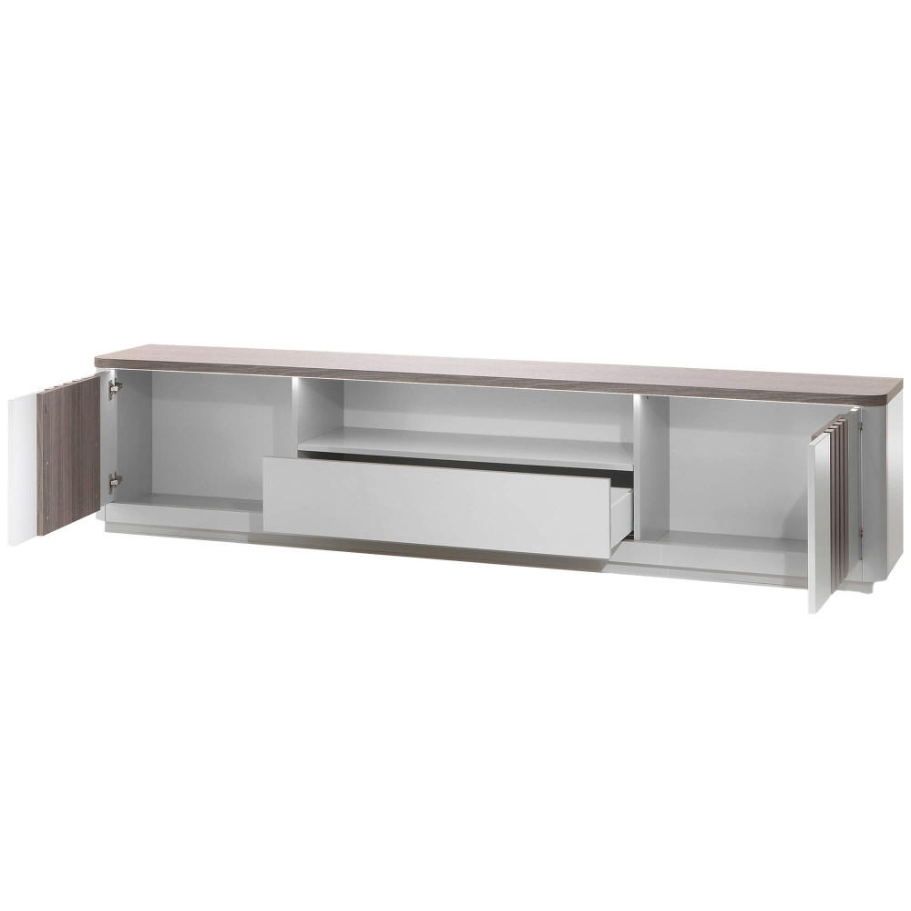 O móvel TV PESARO é uma peça de mobiliário sofisticada e funcional, ideal para complementar a decoração da sua sala de estar. Com 250 cm de largura, este móvel apresenta um design moderno com acabamento em carvalho cinza e detalhes ripados nas portas, que conferem um toque de elegância e estilo.