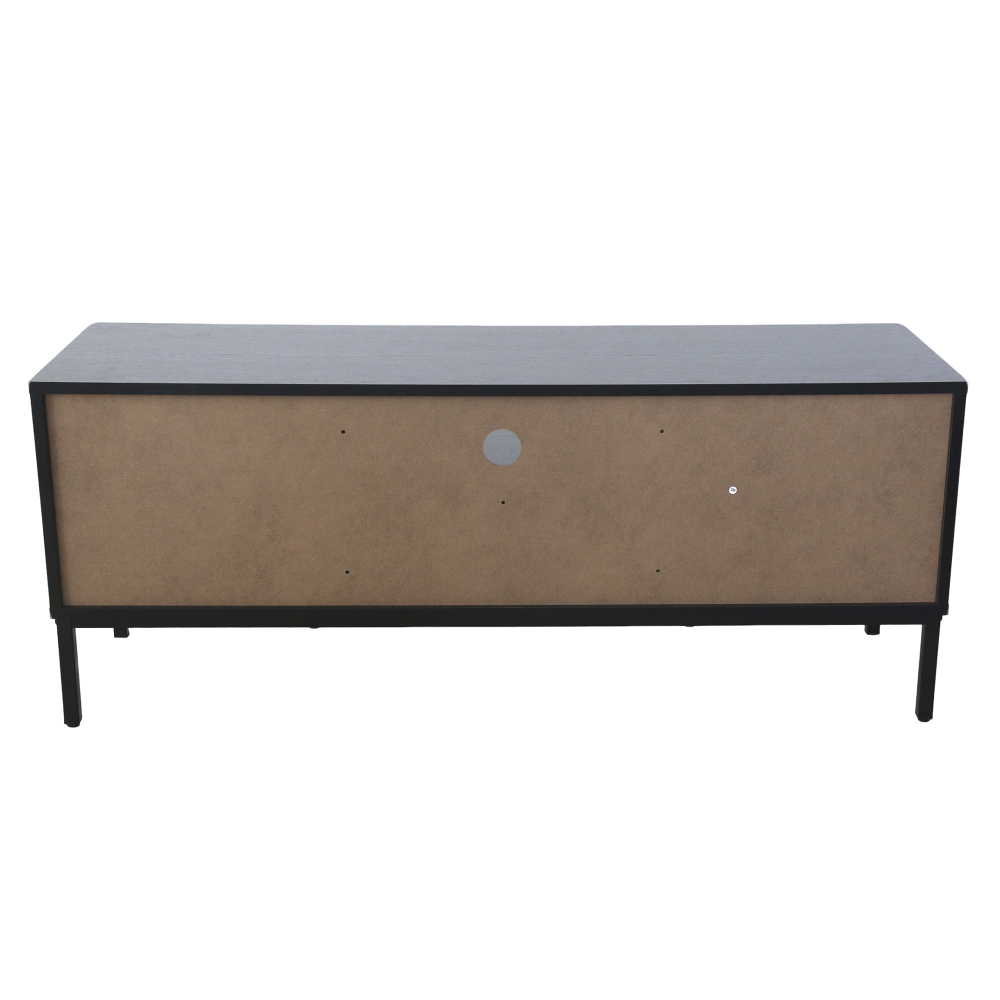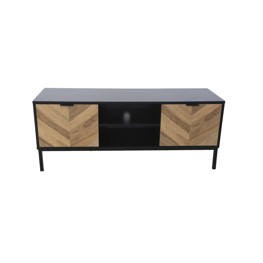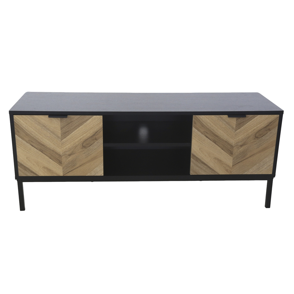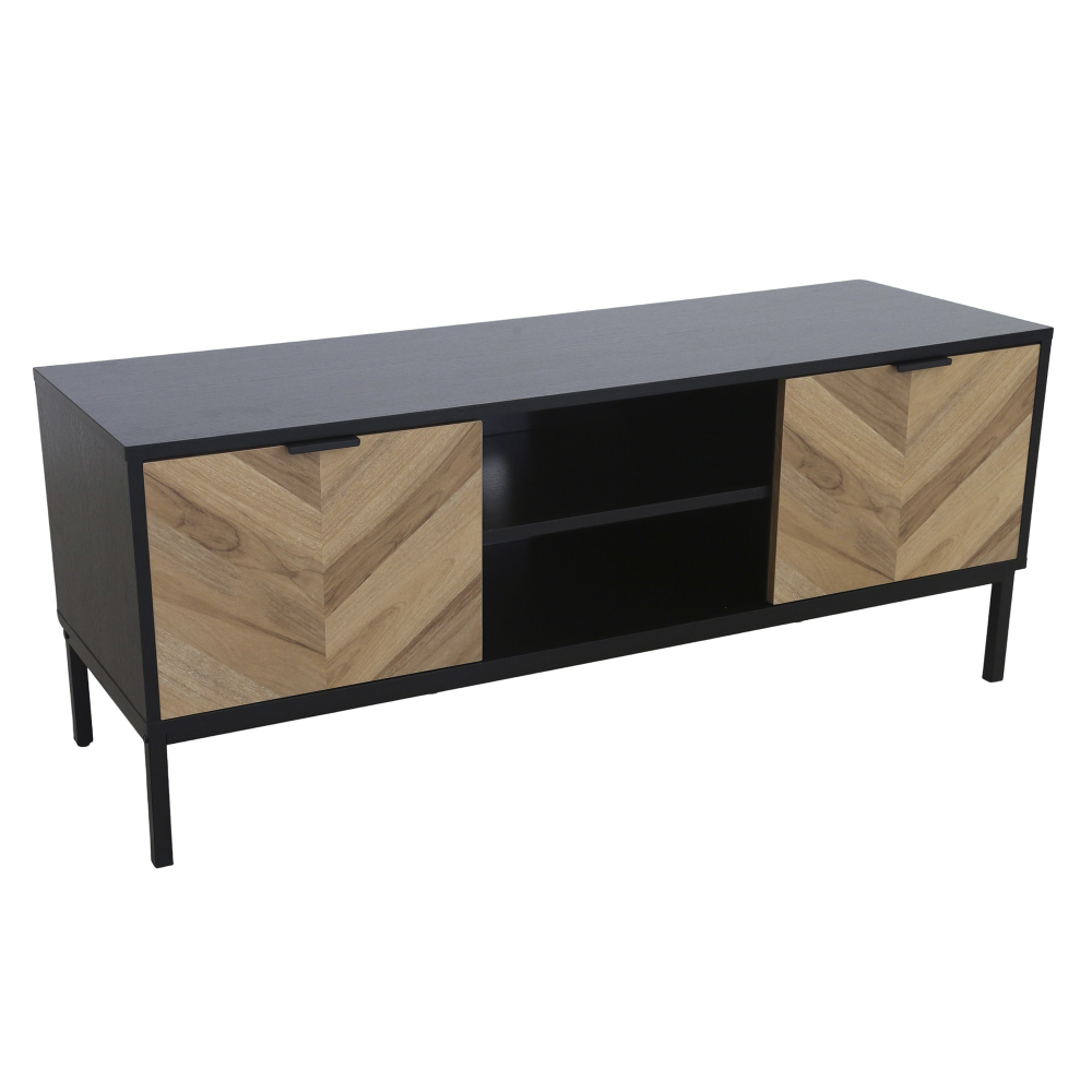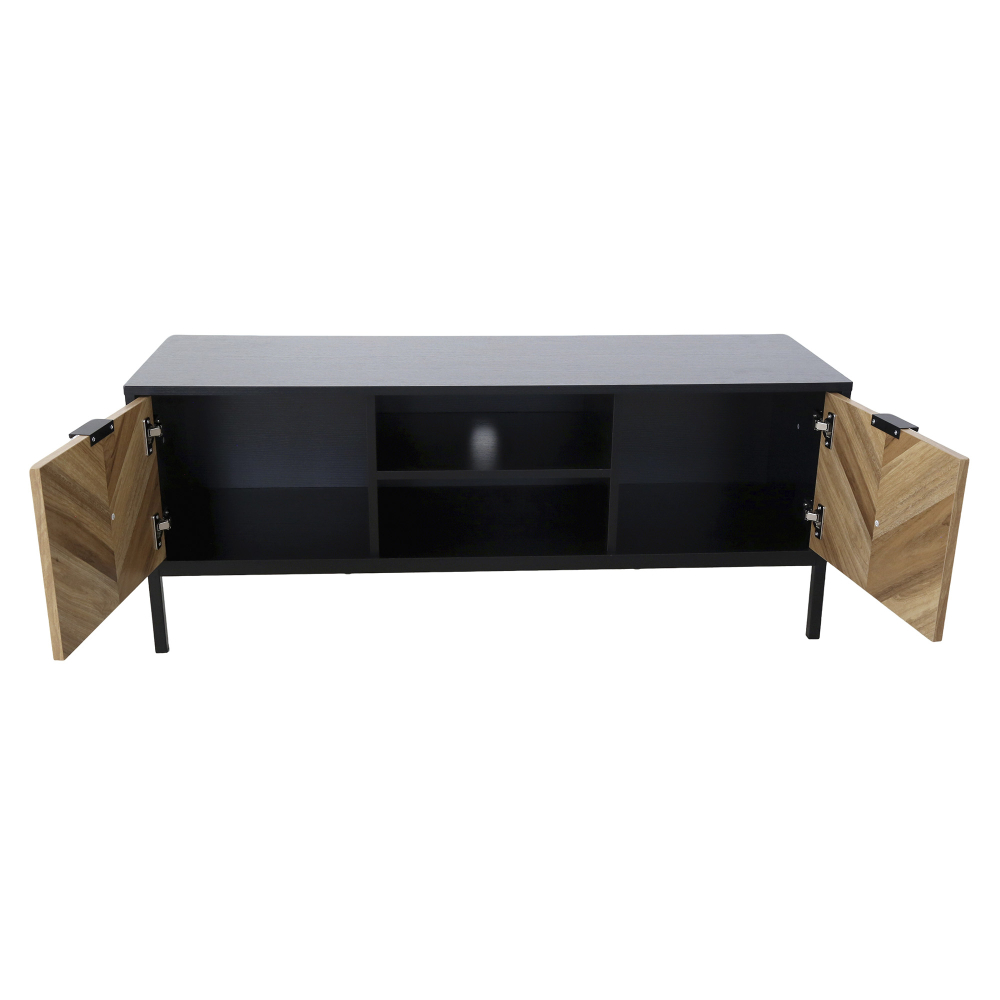 Este móvel TV destaca-se pela combinação perfeita entre estética arrojada e funcionalidade prática. Com 2 portas batentes que ocultam 4 compartimentos internos espaçosos, o móvel TV oferece arrumação generosa para equipamentos, jogos, DVDs e acessórios. A prateleira externa central é ideal para a box de TV, mantendo-a acessível ao comando. A furação estratégica para passagem de cabos garante que tudo fica organizado sem fios à vista. A estrutura em MDF com acabamento em melamina proporciona durabilidade e facilidade de limpeza, enquanto as portas com padrão chevron em madeira criam um contraste visual impressionante. Os pés metálicos elegantes elevam o móvel, facilitando a limpeza por baixo, e os puxadores em alumínio adicionam modernidade. Suportando até 40kg no tampo, este móvel TV é robusto o suficiente para televisores de grande dimensão e combina design industrial com funcionalidade inteligente.