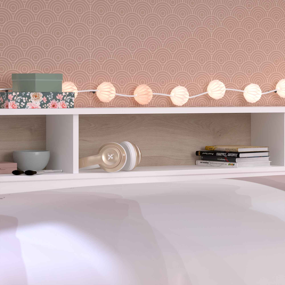 Este pack cama e colchão destaca-se pelas suas soluções de organização inteligentes. A cama SLEEP inclui três nichos estrategicamente posicionados e uma prateleira superior com capacidade para 20 kg, ideal para decoração ou itens do dia-a-dia. Com possibilidade de adicionar duas gavetas opcionais, a versatilidade é total. O acabamento em carvalho japonês e branco confere elegância moderna ao quarto, enquanto a estrutura em painel de partículas com melamina garante robustez. O colchão SPRING ROLLER complementa perfeitamente este pack, fabricado com molas bonel para um suporte firme, combinadas com espuma convoluta e espuma de baixa densidade, revestido em tecido de malha respirável.