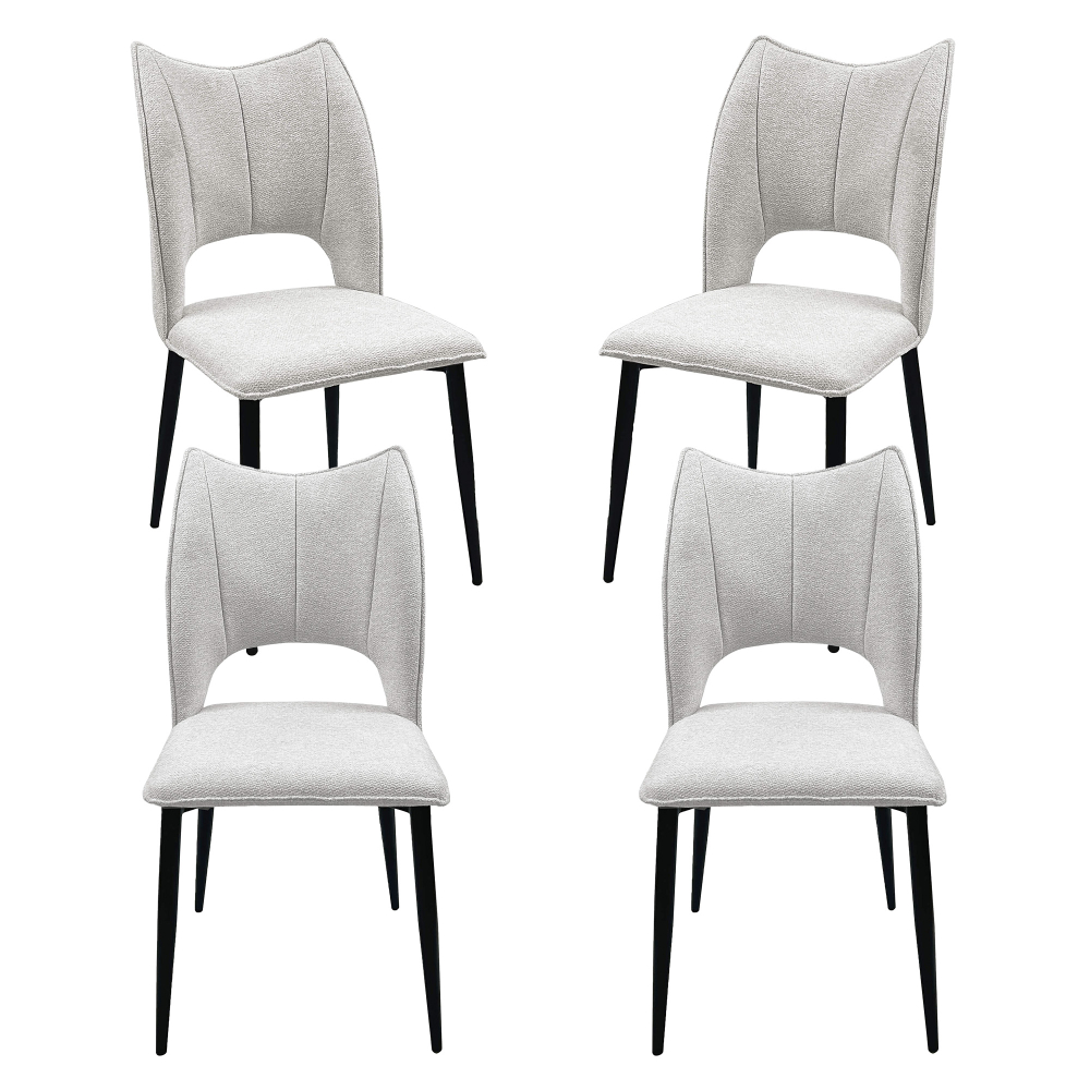 O Pack 4 cadeiras LALIQUE apresenta uma estrutura metálica resistente, com acabamento estofado e revestimento em tecido bouclé. O assento e as costas são enchidos com espuma, garantindo uma base confortável e bem estruturada para o uso diário. A combinação entre materiais sólidos e o tecido texturado assegura estabilidade, durabilidade e uma estética atual.