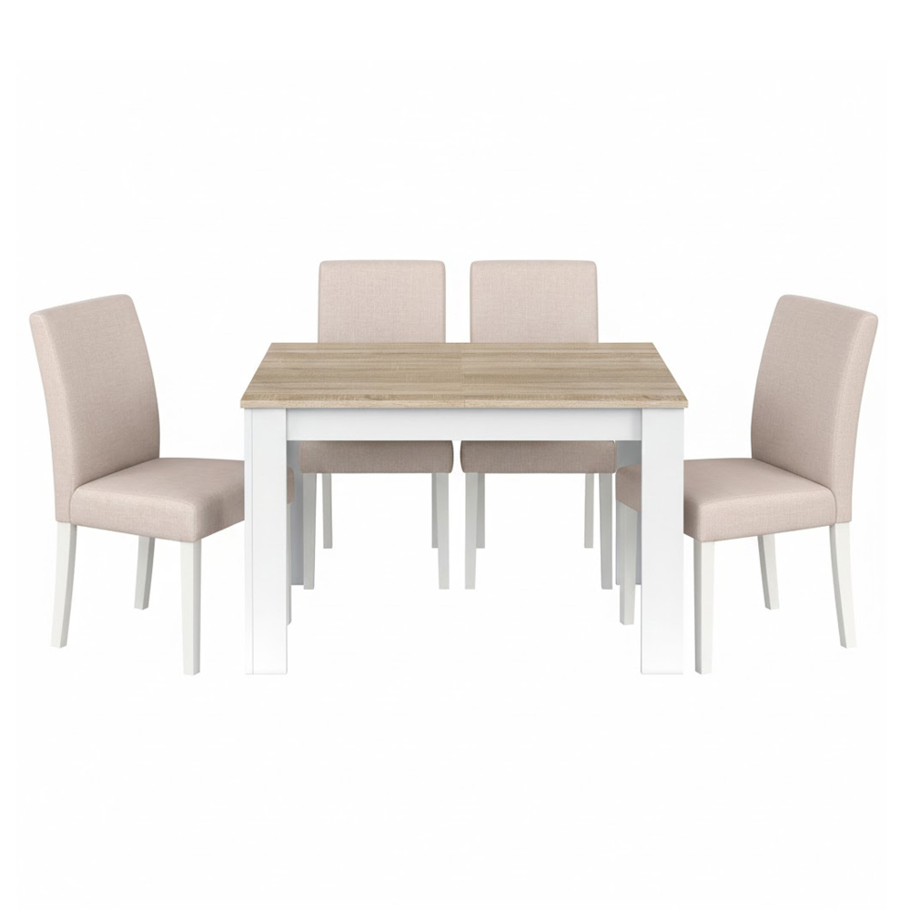 Transforme sua sala de jantar com o nosso pack mesa extensível BARCELONA + 4 Cadeiras JULLIETE, uma combinação perfeita de estilo, funcionalidade e conforto. Este conjunto é ideal para famílias ou para quem gosta de receber amigos e familiares com conforto e elegância. A mesa BARCELONA possui estrutura em painel de partículas revestido com melamina, garantindo durabilidade e fácil manutenção. Com um acabamento em alta qualidade e guias deslizantes de metal, é possível ampliar a mesa de 140 cm para 190 cm de comprimento, oferecendo mais espaço para acomodar até 6 pessoas confortavelmente.