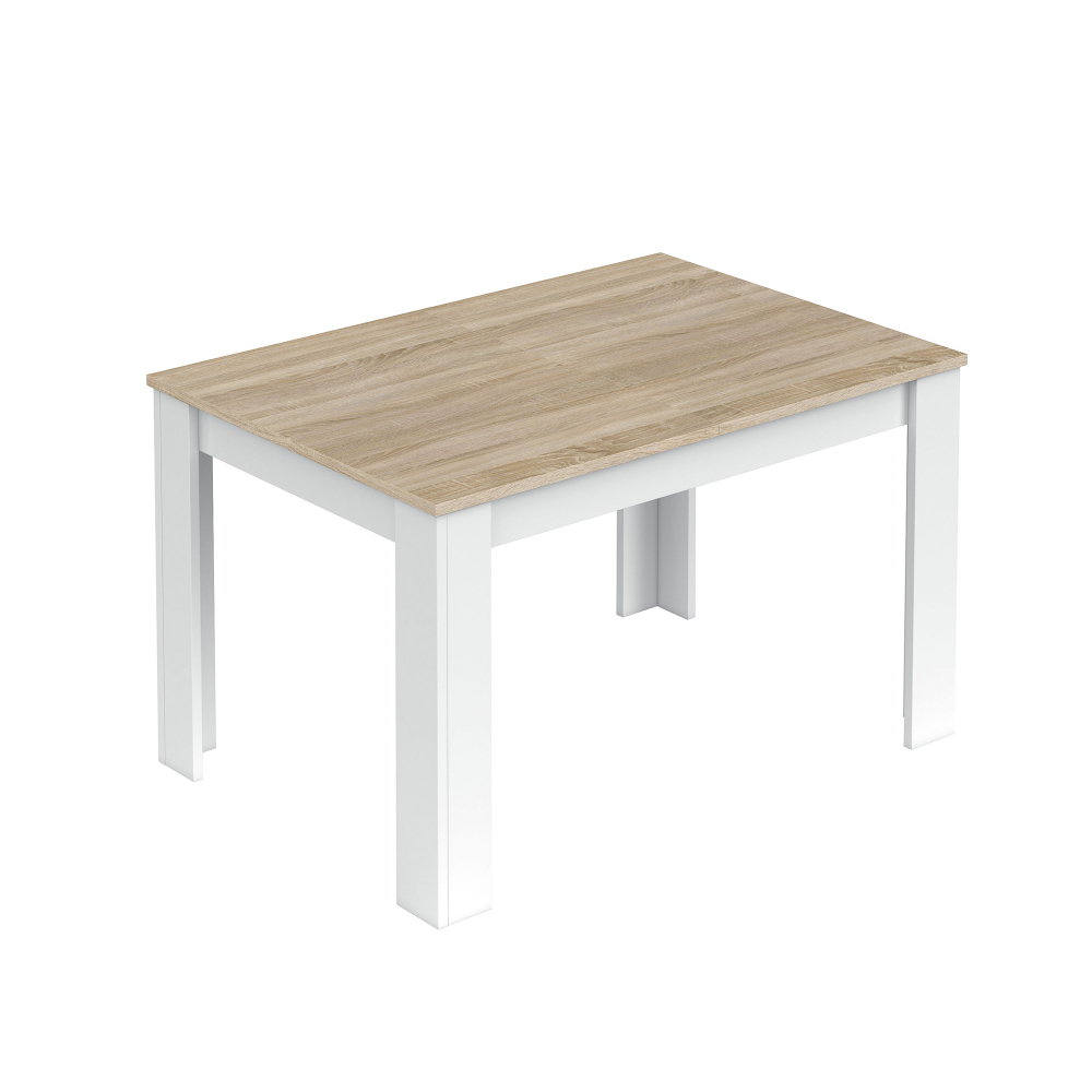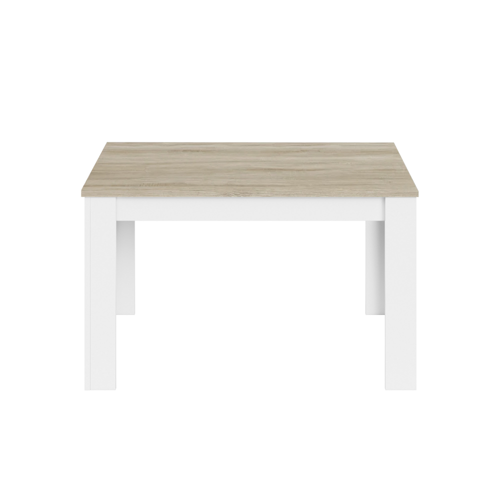 O pack mesa BARCELONA + 6 cadeiras SOPHIE inclui uma mesa extensível de 140 a 190 cm, com estrutura em painel de partículas e revestimento em melamina, combinando branco e carvalho para um visual atual e luminoso. A extensão da mesa é feita através de guias deslizantes em metal, com fechos metálicos que garantem estabilidade quando aberta. Os pés incluem conectores em ABS anti-ruído e anti-riscos. As cadeiras SOPHIE apresentam estrutura em painel de partículas e polipropileno, com assento revestido em pele sintética, oferecendo conforto e fácil manutenção.