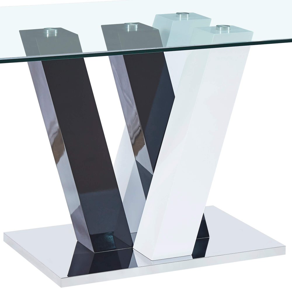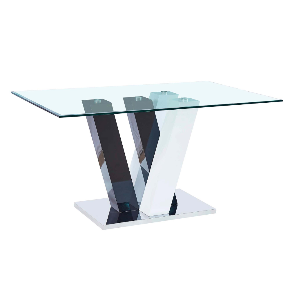 A mesa NELLY destaca-se pelo tampo em vidro temperado e base lacada a alto brilho, com pés em MDF reforçados por aço inoxidável — uma fusão perfeita entre resistência e sofisticação. As cadeiras NATALIA II, com estrutura metálica e revestimento em pele sintética, garantem conforto e durabilidade graças à espuma de poliuretano de alta densidade. O conjunto mesa e cadeira adapta-se facilmente a diferentes estilos de decoração, oferecendo um toque de modernidade ao ambiente.