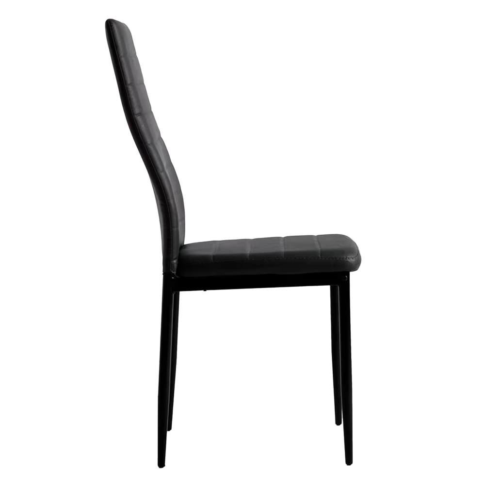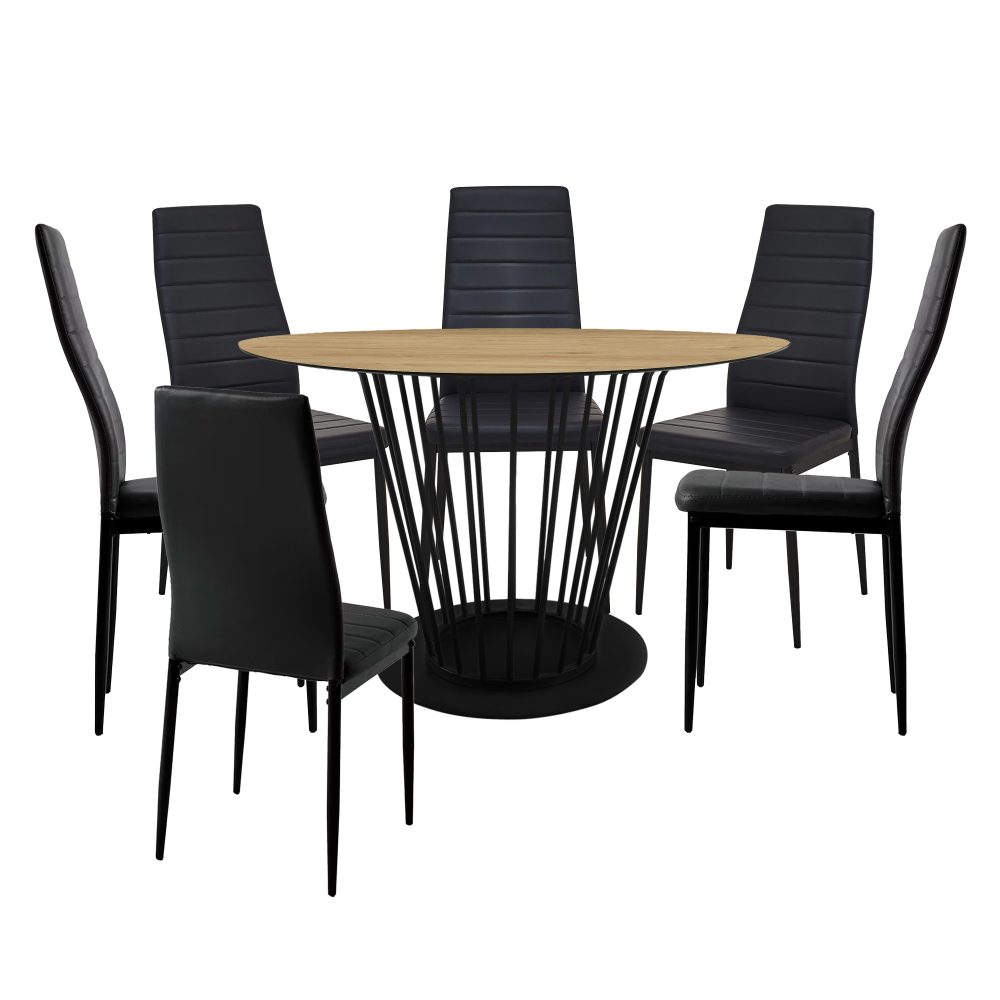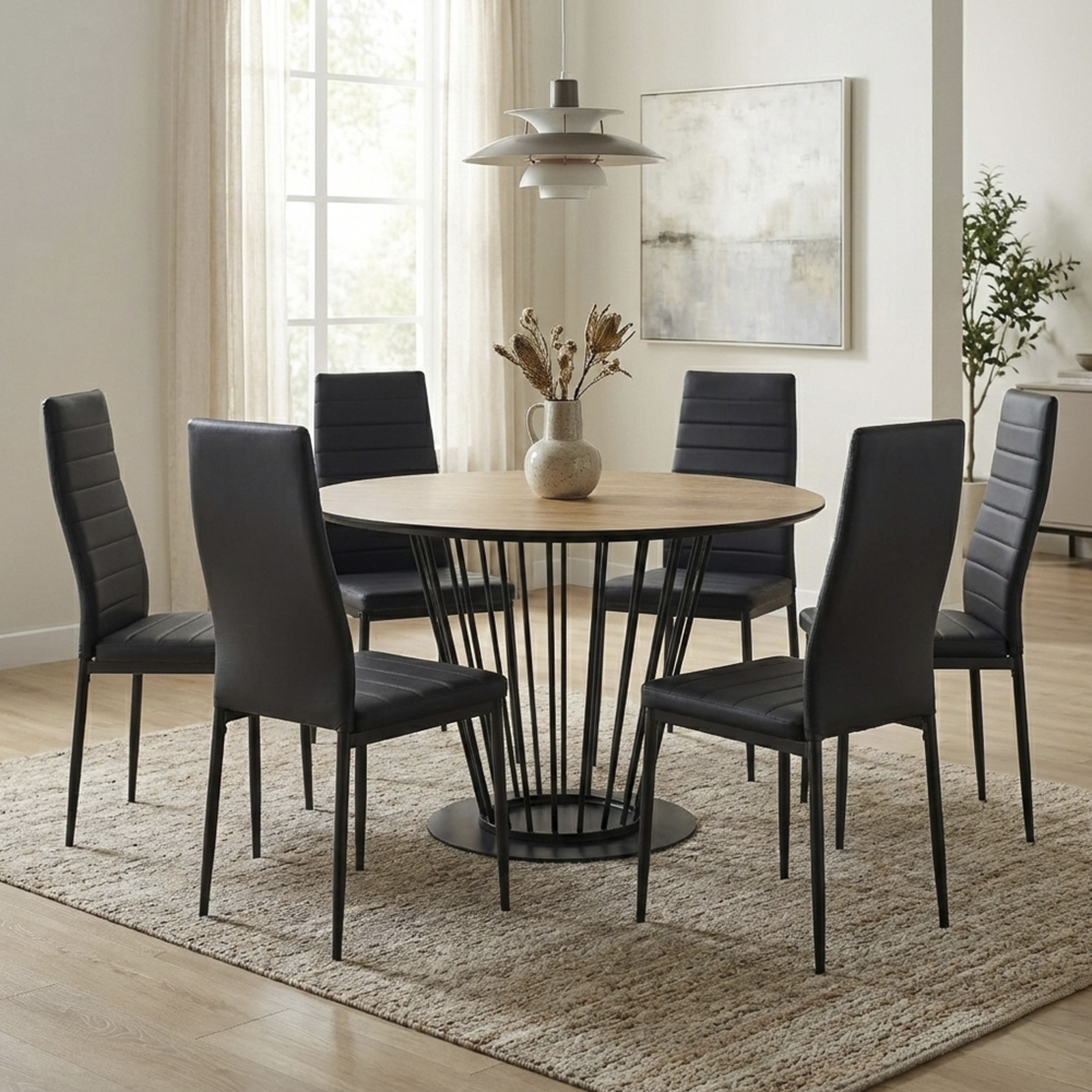 Este pack de mesa e cadeiras distingue-se pela sua estética moderna e minimalista. A mesa redonda ALESIA apresenta um tampo em MDF com acabamento elegante, sustentado por uma estrutura metálica robusta com revestimento a pó preto que oferece durabilidade, resistência a impactos e evita corrosão. Com capacidade para suportar até 60 kg, a mesa garante estabilidade durante as refeições. As 6 cadeiras ZARA II elevam o conforto a outro nível, revestidas a pele sintética de alta qualidade e estrutura metálica resistente. As costuras decorativas no assento e costas adicionam um toque de requinte e reforçam a durabilidade. Este pack de mesa e cadeiras combina materiais cuidadosamente selecionados para proporcionar resistência e estilo duradouro.