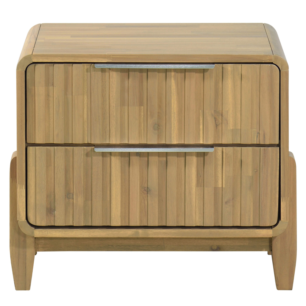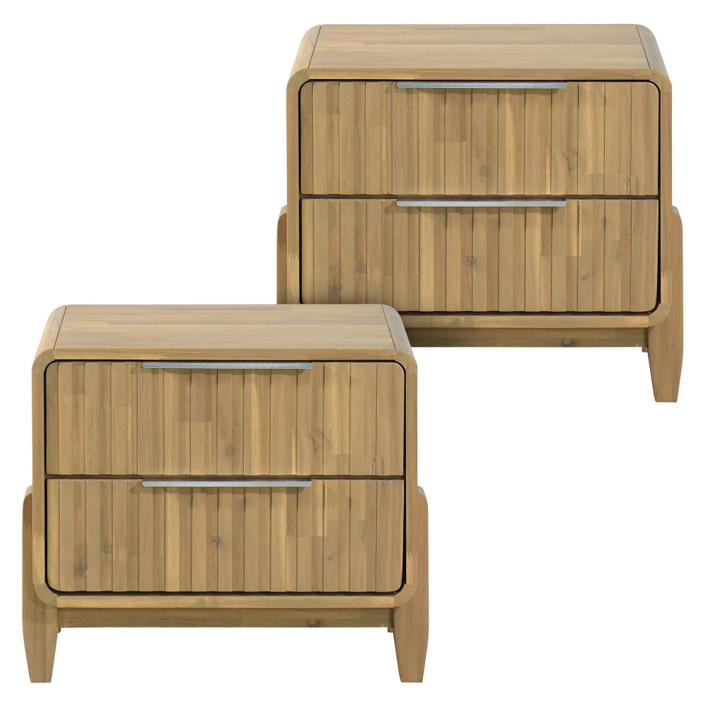 A mesa de cabeceira KIANA apresenta uma estrutura em madeira natural com linhas retas e acabamento intemporal. Equipada com duas gavetas práticas, é ideal para guardar livros, acessórios ou pequenos objetos, mantendo o quarto sempre organizado.