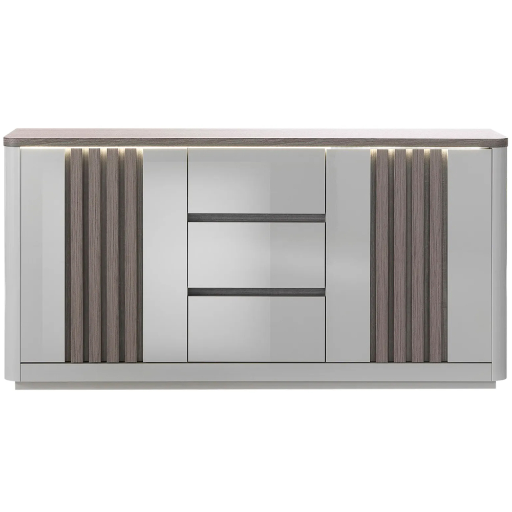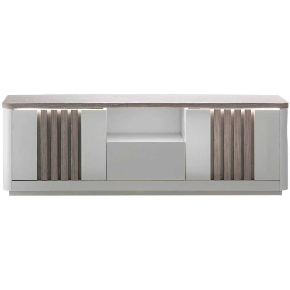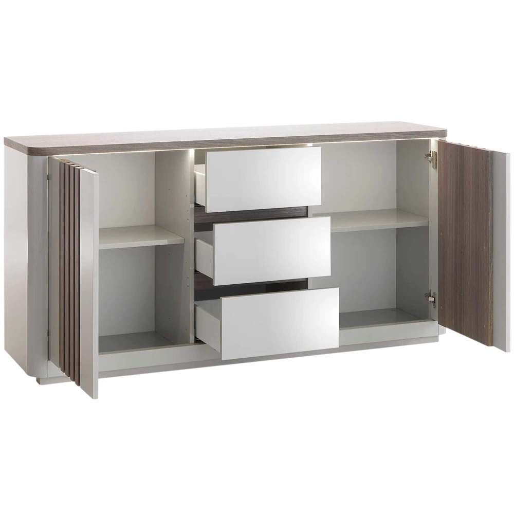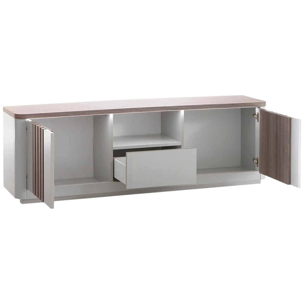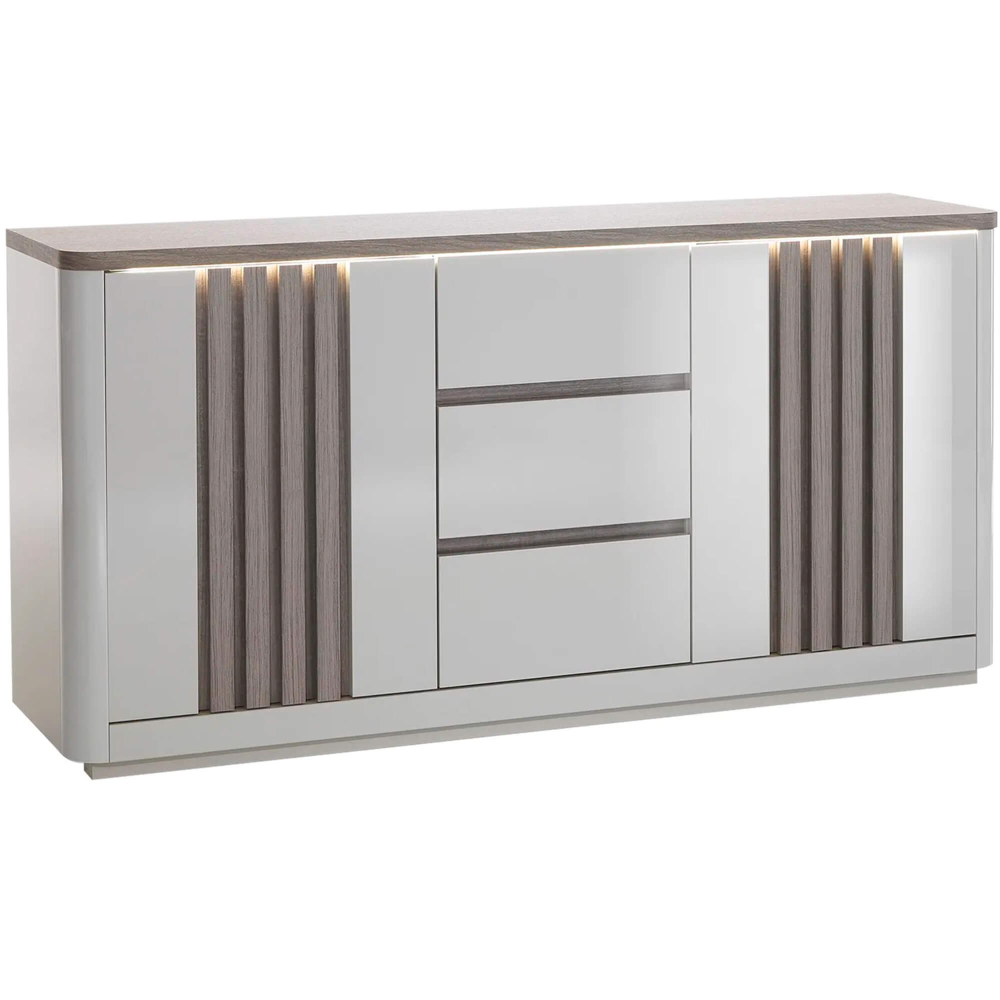 Tem uma mesa extensível PESARO com um mecanismo de extensão da mesa que é prático e intuitivo, com um fecho suave para maior segurança. Tem uns pés ripados em carvalho cinza, dando estabilidade e elegância à peça. O aparador PESARO dispõe de três gavetas lacadas em alto brilho e duas portas com efeito ripado em carvalho cinza, oferecendo um amplo espaço para organização. Conta com uma luz branca com conexão de cabo elétrico, ideal para criar uma atmosfera acolhedora e moderna. Por fim, o móvel de TV PESARO inclui duas portas ripadas em carvalho cinza, uma prateleira central e uma gaveta lacada cinza brilhante para maior organização. Dispõe, também, de uma luz LED branca que adiciona um toque de modernidade e cria uma iluminação suave ao ambiente.