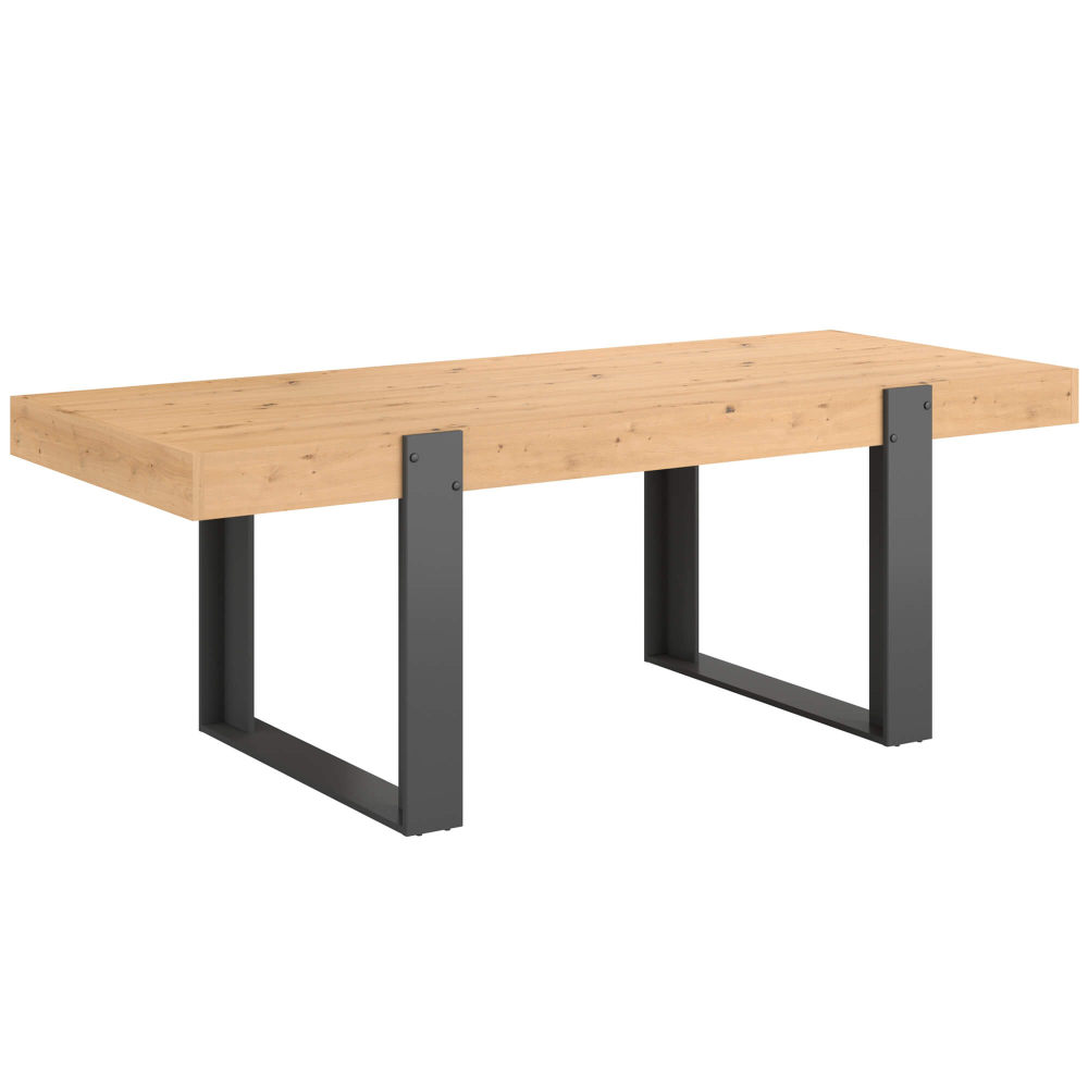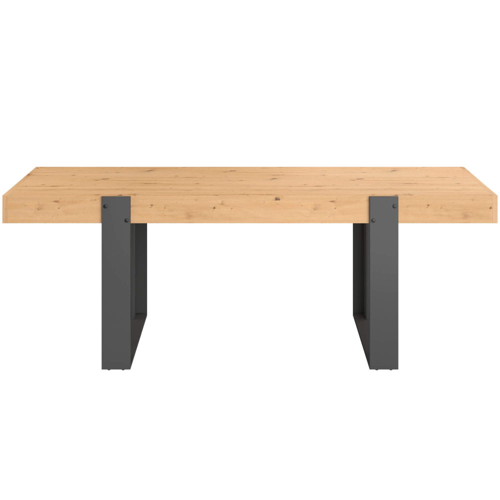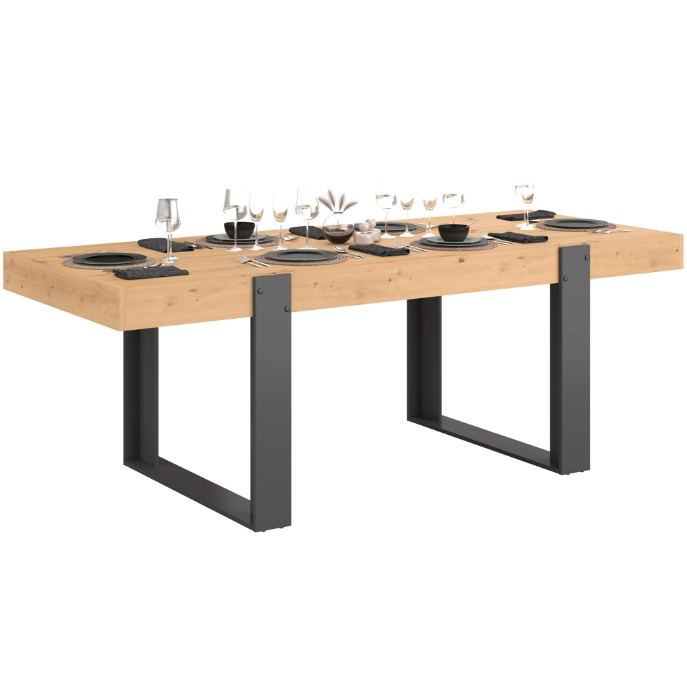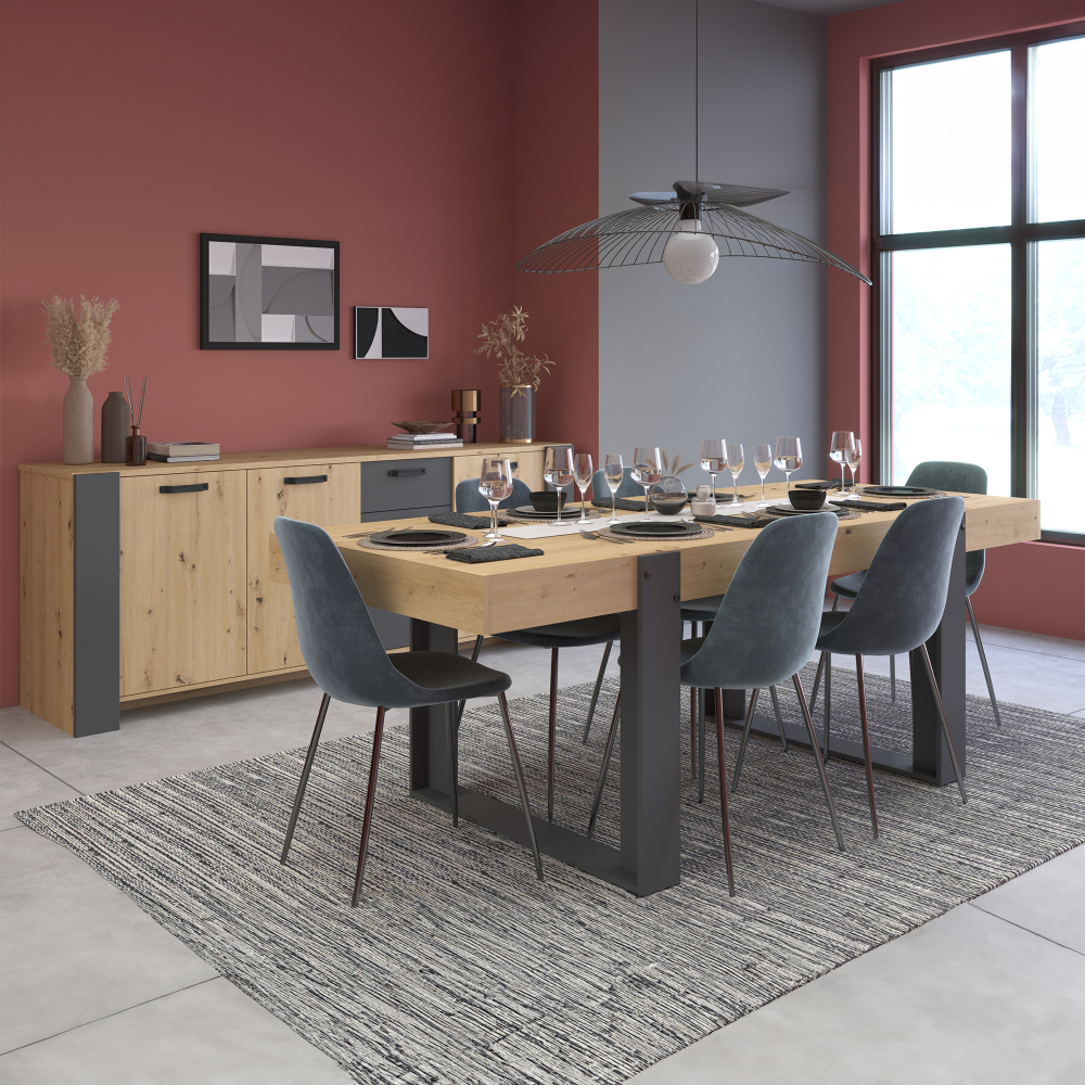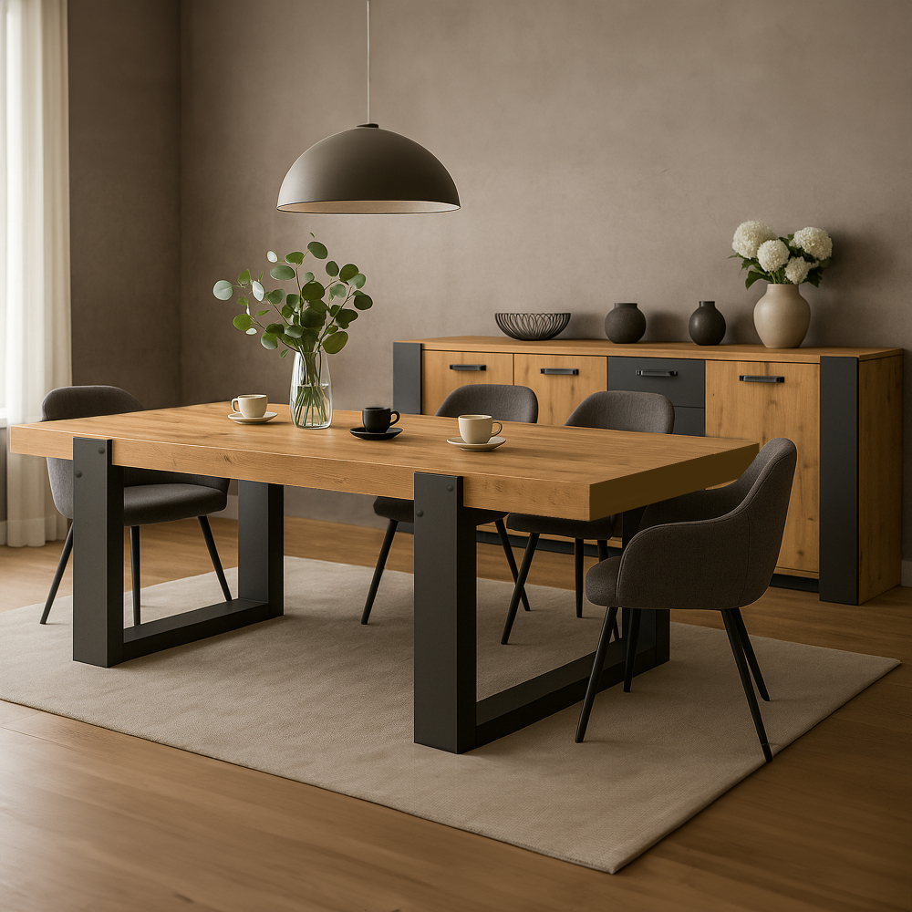 O Pack Sala de Jantar TRAVIS é a escolha ideal para quem procura um ambiente de refeições com forte identidade visual e traços industriais modernos. Este conjunto inclui uma mesa de jantar retangular de grandes dimensões e um aparador coordenado, ambos com acabamento amadeirado e elementos em preto mate que reforçam o contraste estético.