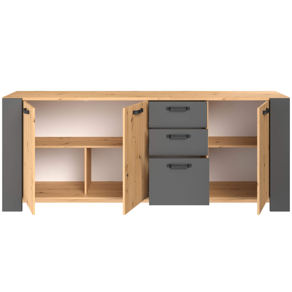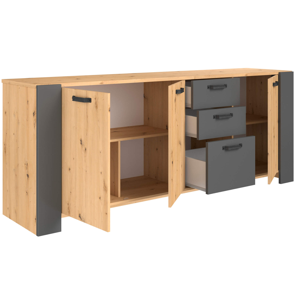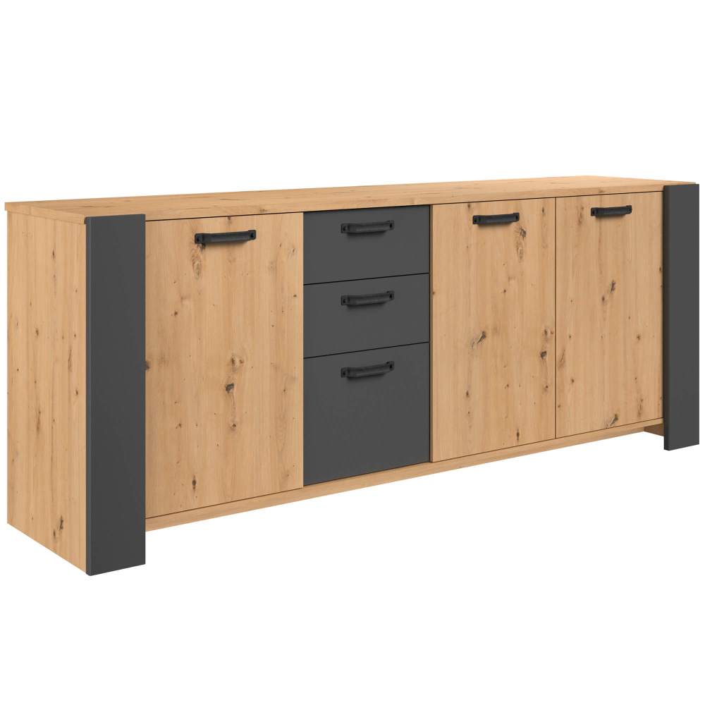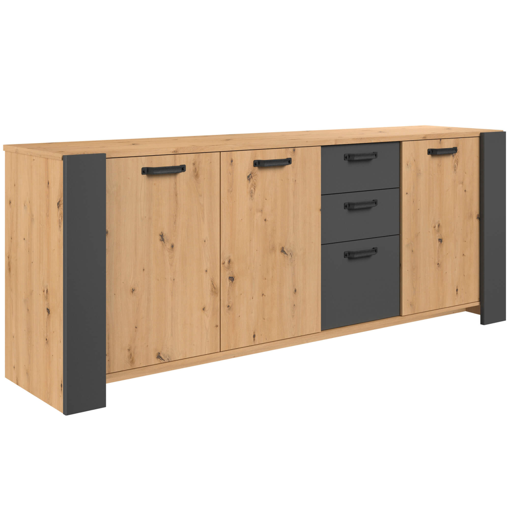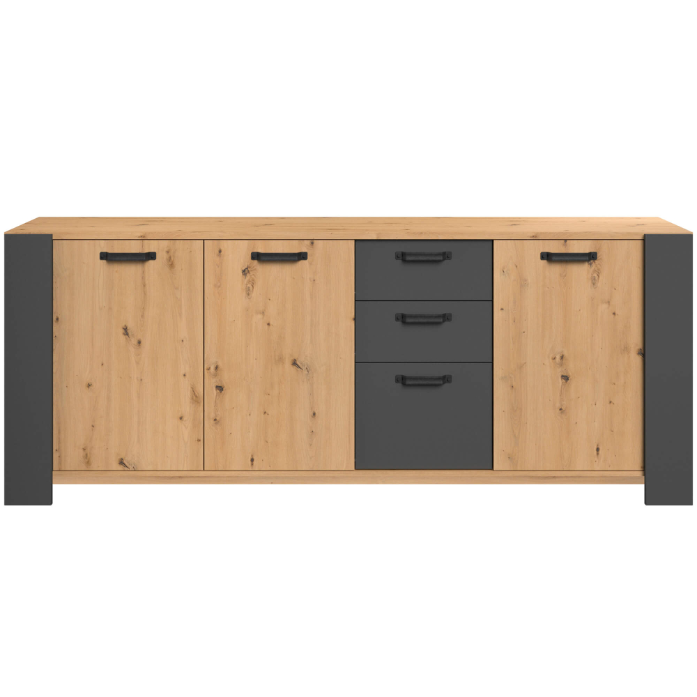 O Pack Sala de Jantar TRAVIS é a escolha ideal para quem procura um ambiente de refeições com forte identidade visual e traços industriais modernos. Este conjunto inclui uma mesa de jantar retangular de grandes dimensões e um aparador coordenado, ambos com acabamento amadeirado e elementos em preto mate que reforçam o contraste estético.
