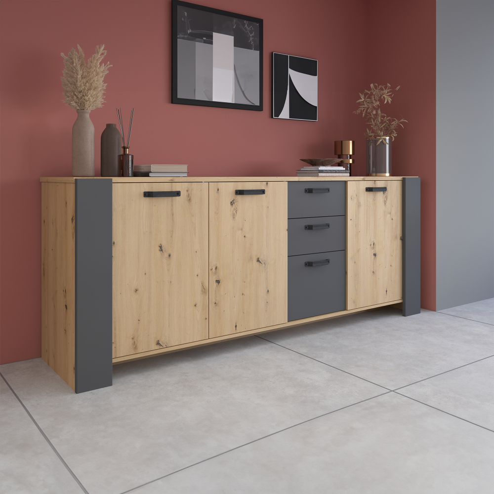 A mesa destaca-se pelo tampo espesso e pela estrutura em aglomerado de partículas em forma de U invertido, proporcionando estabilidade e imponência ao espaço. Já o aparador oferece arrumação generosa com portas e gavetas, ideal para guardar louça, têxteis ou objetos de uso frequente, mantendo tudo organizado e acessível.
