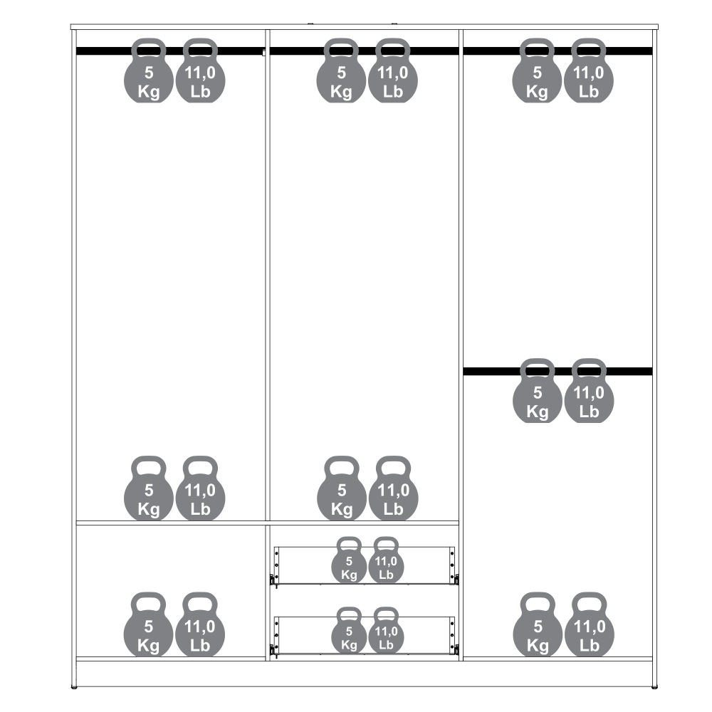 Este roupeiro destaca-se pela sua capacidade de arrumação inteligente e acabamentos de qualidade. Com 6 portas batentes que abrem para revelar um interior espaçoso, o roupeiro inclui 4 varões em alumínio resistentes para pendurar casacos, vestidos e camisas, 2 prateleiras internas ideais para roupa dobrada ou caixas organizadoras, e 2 gavetas amplas perfeitas para roupa interior, acessórios ou pequenos itens. A estrutura é fabricada em painel de partículas de 15mm de espessura com acabamento brilho em pintura UV que confere um aspeto moderno e sofisticado, enquanto o interior apresenta pintura UV na cor linho que clareia o espaço. Os puxadores em MDF com detalhes em madeira adicionam elegância. Com capacidade para suportar até 50kg no total, este roupeiro combina robustez e design contemporâneo que valoriza qualquer quarto.