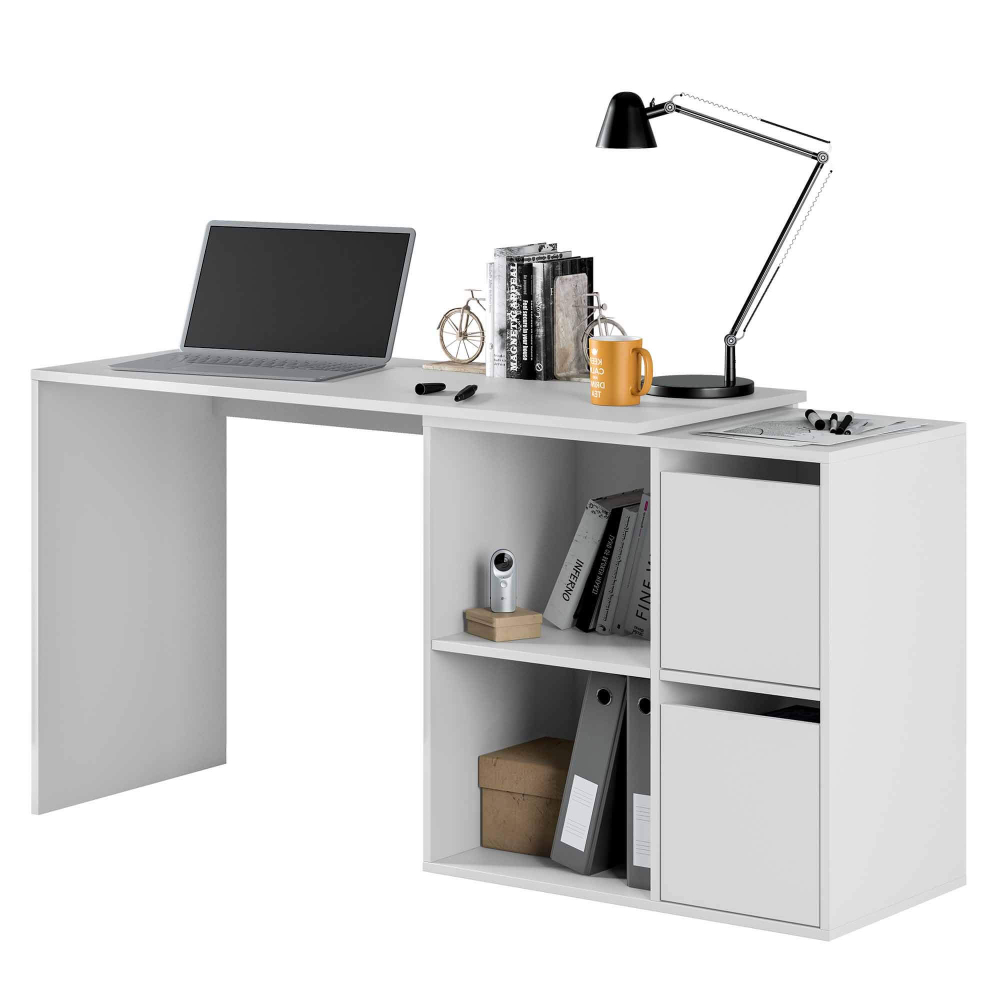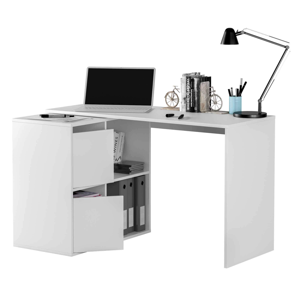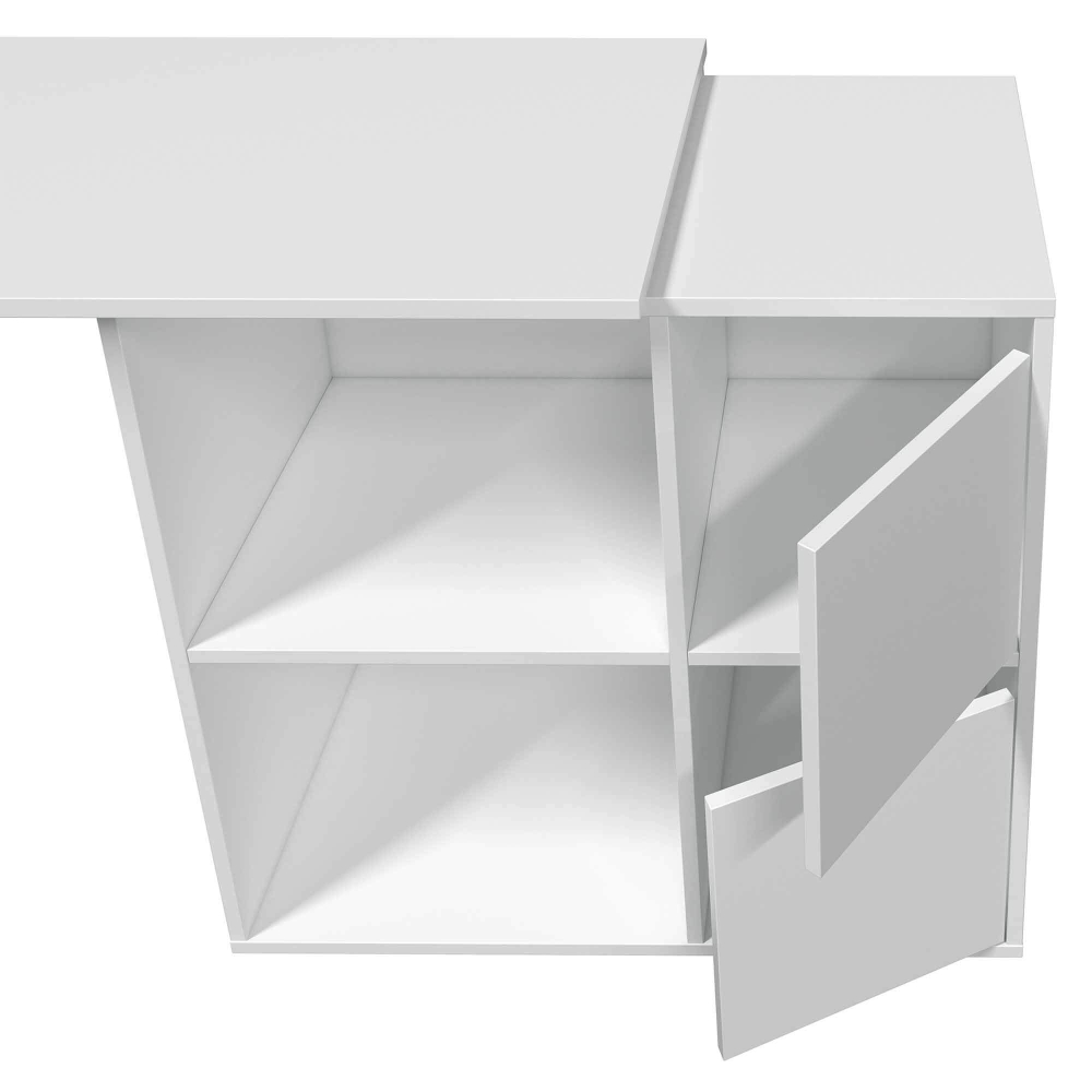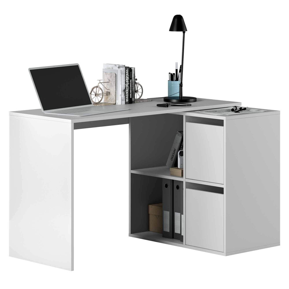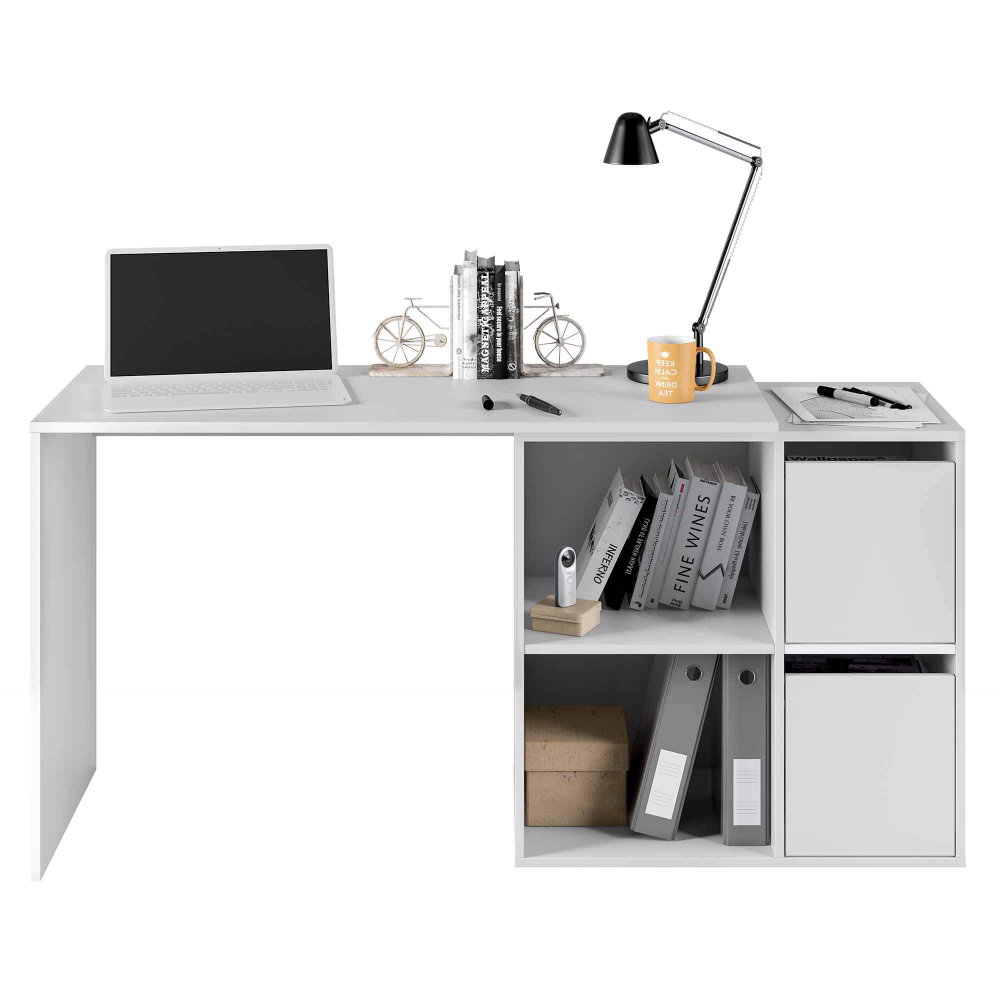 O seu sistema multiposição permite utilizá-la como mesa retangular ou secretária de canto, ajustando-se facilmente à configuração do espaço. O módulo lateral inclui duas portas e dois nichos abertos, perfeitos para guardar livros, documentos ou acessórios de escritório.