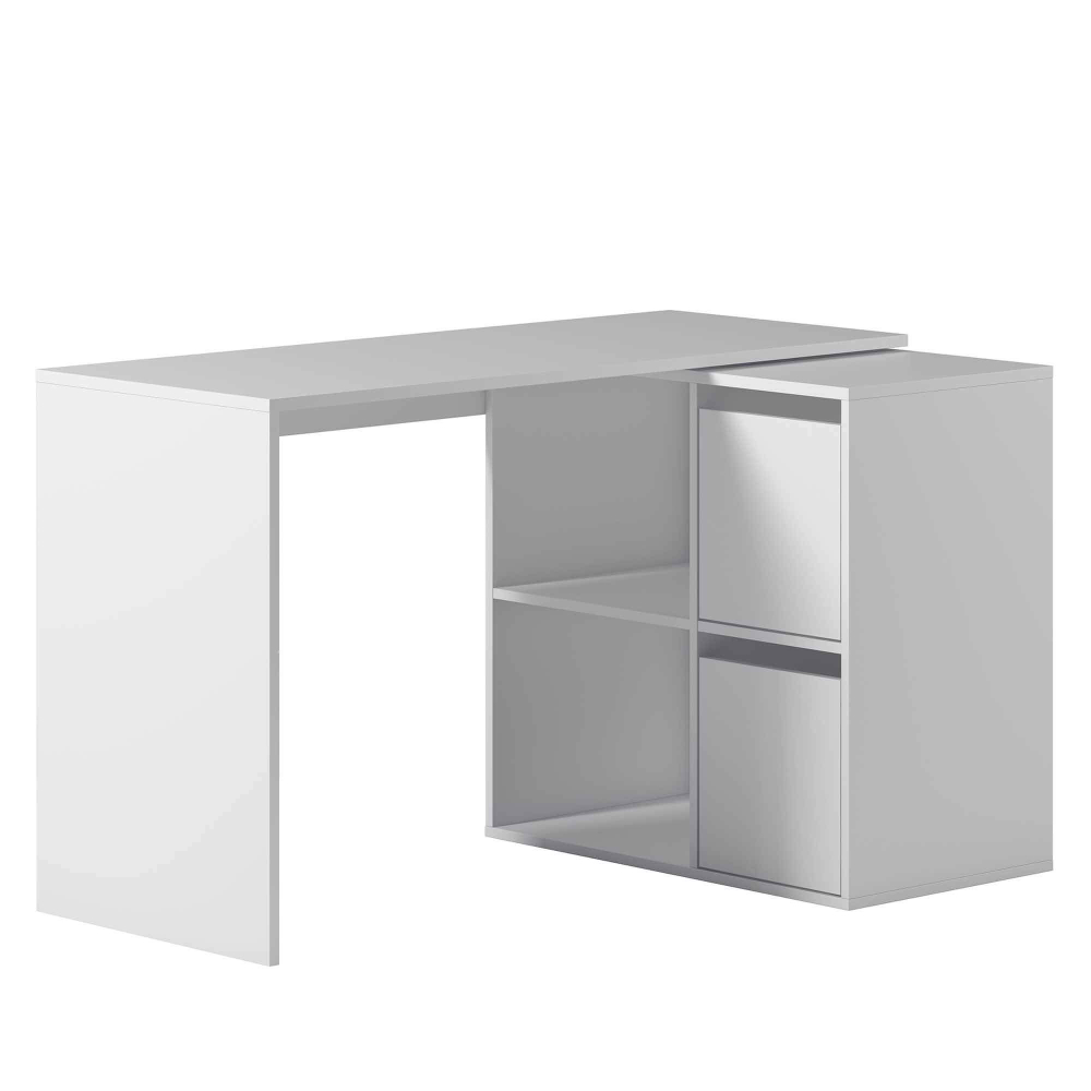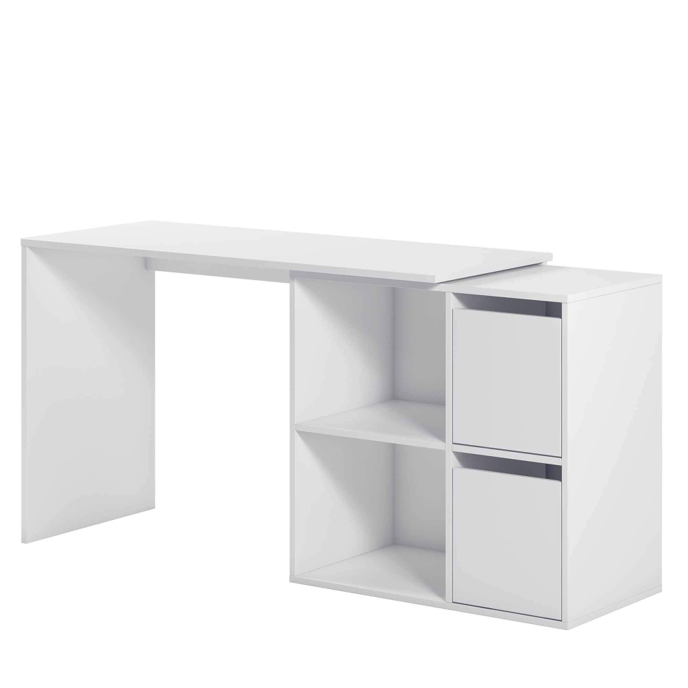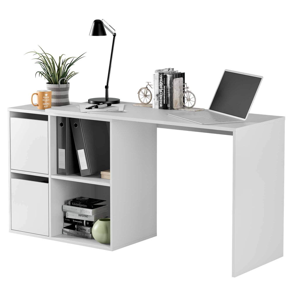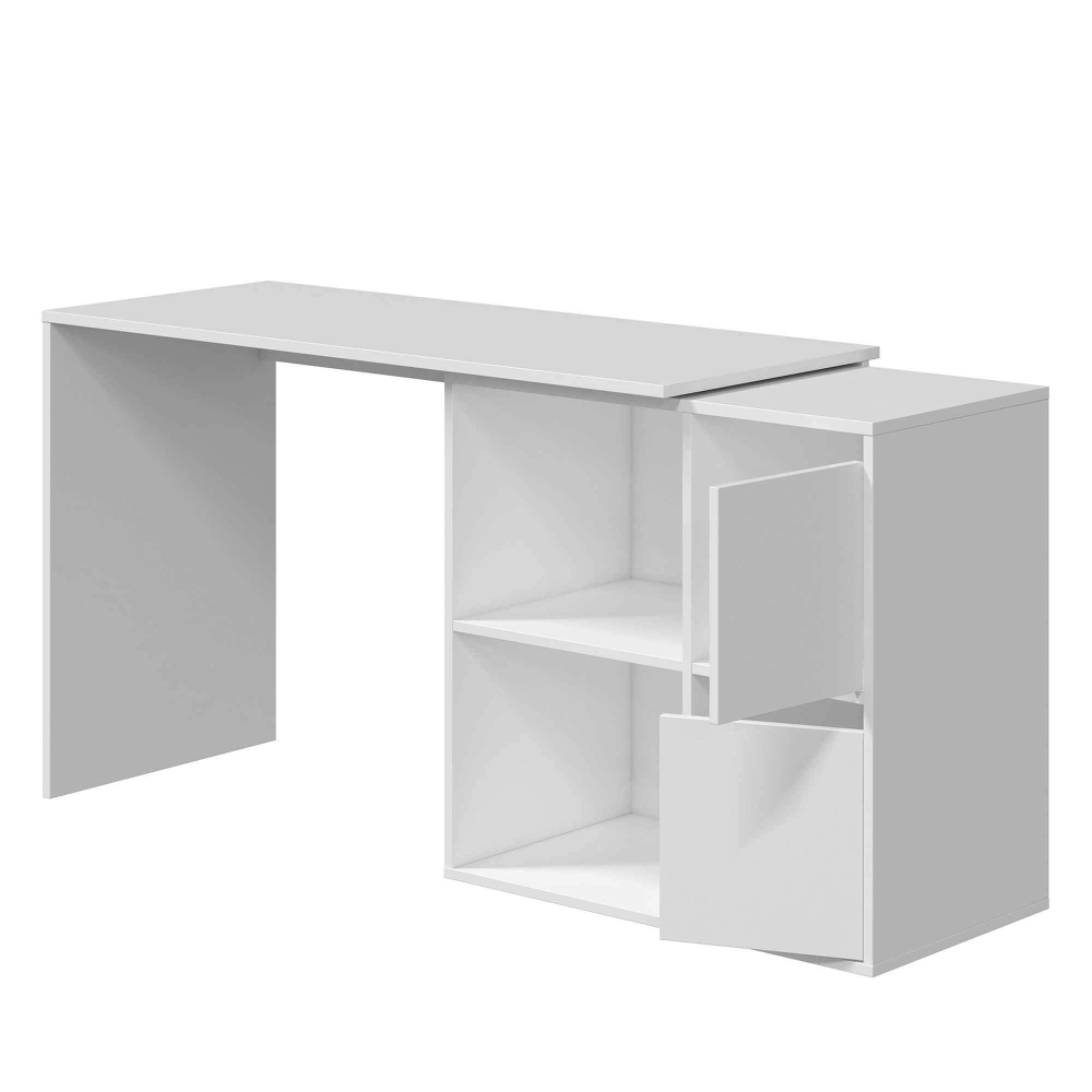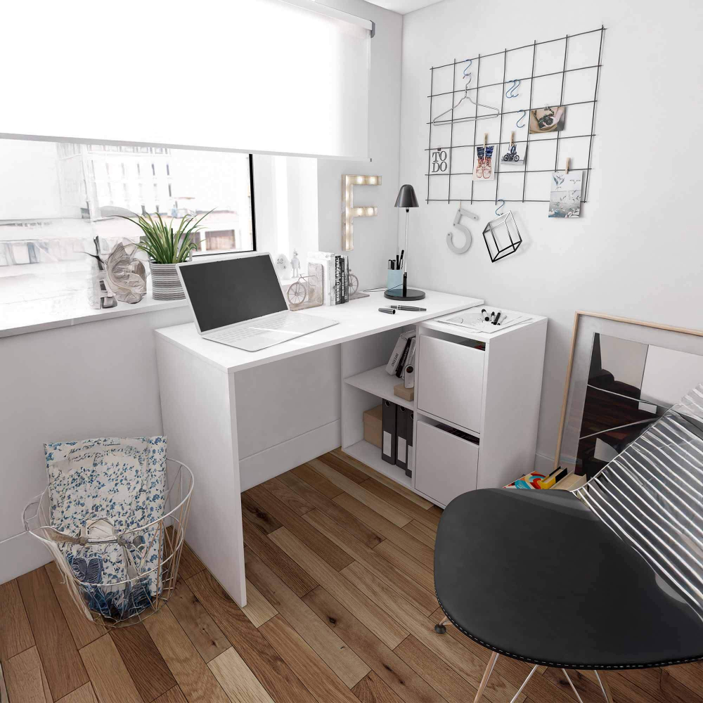 O seu sistema multiposição permite utilizá-la como mesa retangular ou secretária de canto, ajustando-se facilmente à configuração do espaço. O módulo lateral inclui duas portas e dois nichos abertos, perfeitos para guardar livros, documentos ou acessórios de escritório.