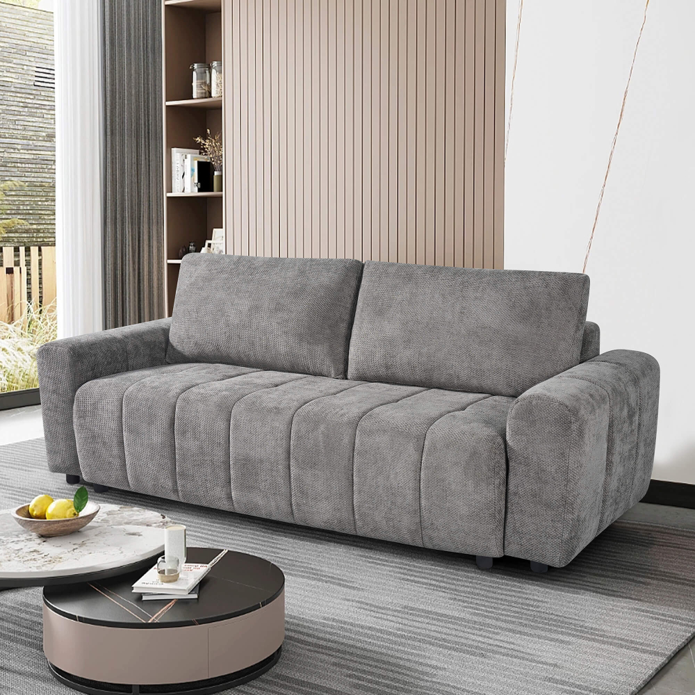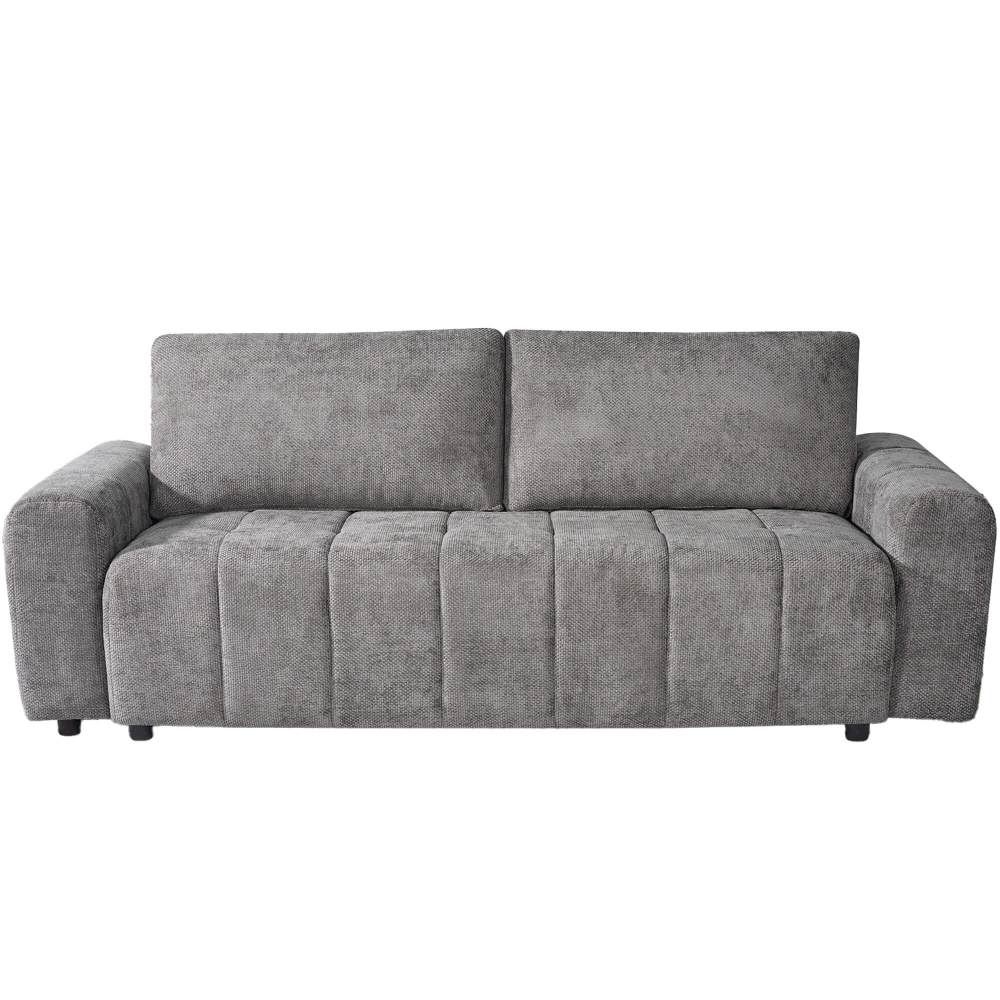 O sofá cama KATIE é a solução perfeita para quem procura funcionalidade e elegância num único móvel. Este sofá de 3 lugares destaca-se pela sua capacidade de transformação, convertendo-se facilmente numa cama, ideal para receber visitas. Além disso, conta com um baú espaçoso por baixo do assento, proporcionando uma prática área de arrumação para guardar mantas, almofadas ou outros objetos.