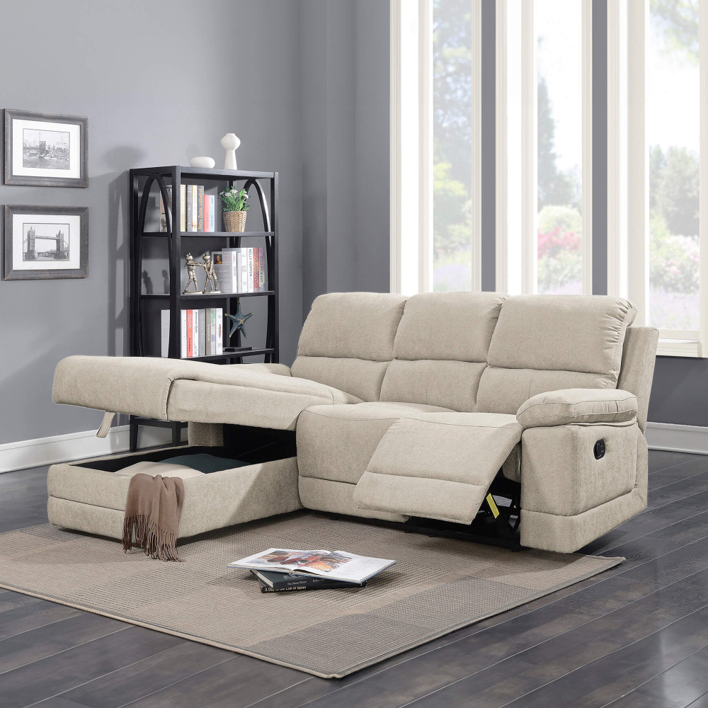 Uma das grandes mais-valias deste sofá é a função de elevação manual de pernas, que permite o ajuste do assento, oferecendo conforto personalizado para relaxar após um longo dia. Esta funcionalidade é controlada por uma alavanca simples e prática. O sofá inclui uma chaise longue espaçosa, com 133 cm de profundidade, onde pode estender as pernas confortavelmente. Esta chaise dispõe ainda de um baú de arrumação integrado, ideal para guardar mantas, almofadas ou outros objetos, ajudando a manter a sala organizada!
