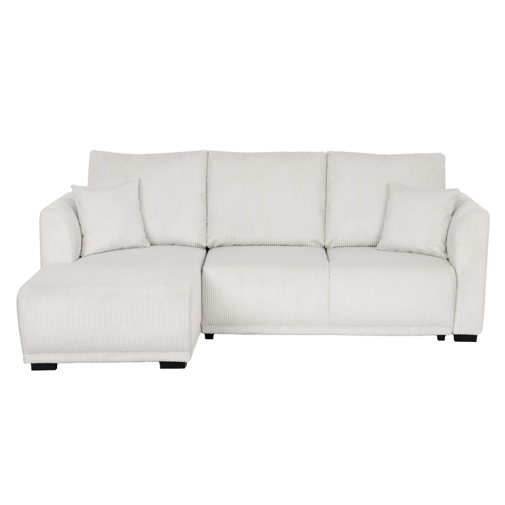 A estrutura é fabricada em madeira de pinho, Platex, MDF e contraplacado, garantindo robustez e durabilidade. Os assentos são compostos por molas zigue-zague e espuma de alta densidade, enquanto os encostos misturam fibra e flocos, proporcionando máximo conforto. O revestimento em tecido cotelê 100% poliéster confere-lhe um toque macio e sofisticado, acompanhado por uns pés discretos em plástico. Inclui ainda duas almofadas decorativas, perfeitas para completar o visual. Suporta até 300 kg e adapta-se a qualquer espaço graças ao seu design elegante e funcional.