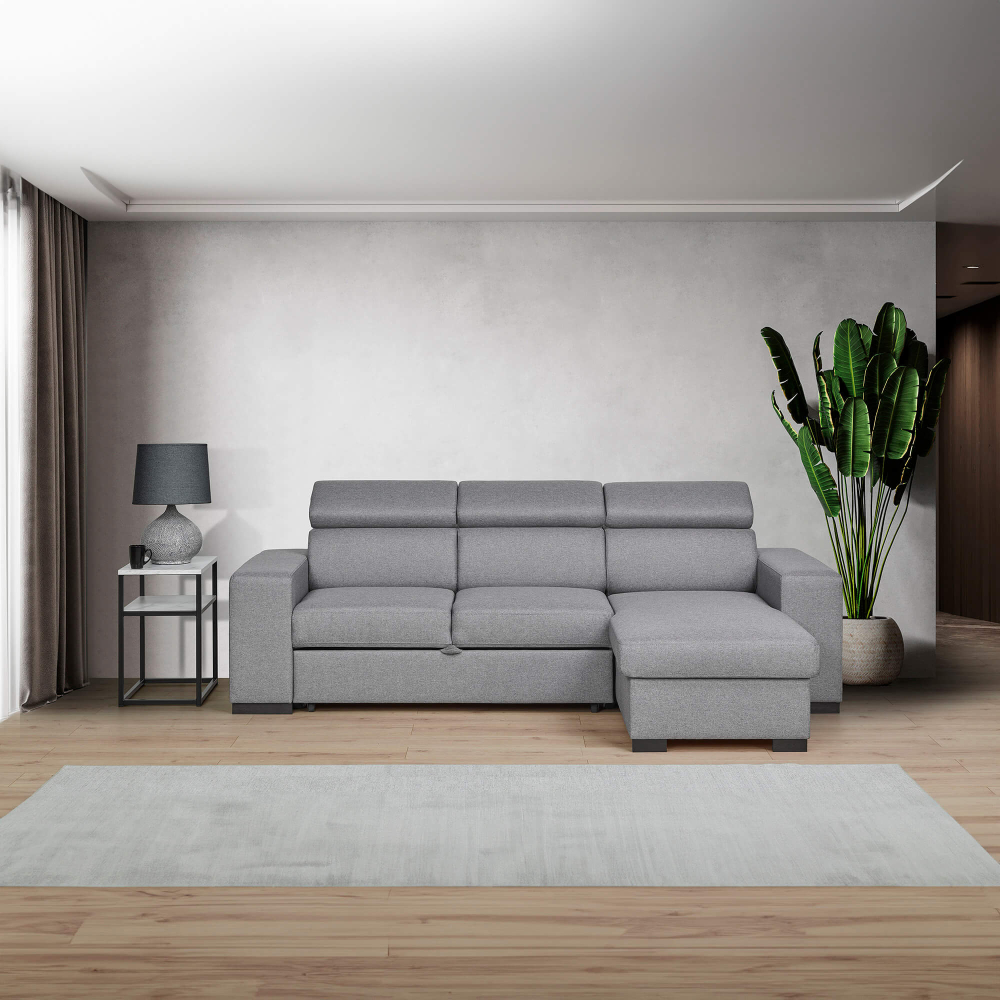 Numa altura em que cada centímetro da sua sala deve ser bem aproveitado, este sofá chaise longue reversível JORDAN II com cama, baú e puffs é a solução ideal. Permite receber amigos com conforto, guardar mantas e almofadas no baú e, num piscar de olhos, transformar-se numa cama aconchegante. Um exemplo? Chegam os amigos para ver um filme — reclina os encostos, tira os poufs e todos ficam confortáveis num só espaço.