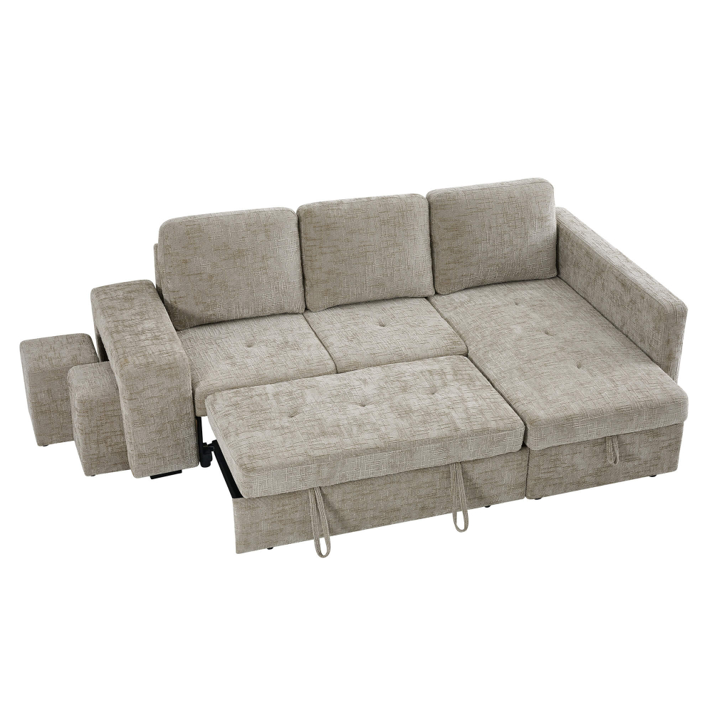 Sofá STACY II com cama, baú e puffs: conforto, funcionalidade e design moderno num só.