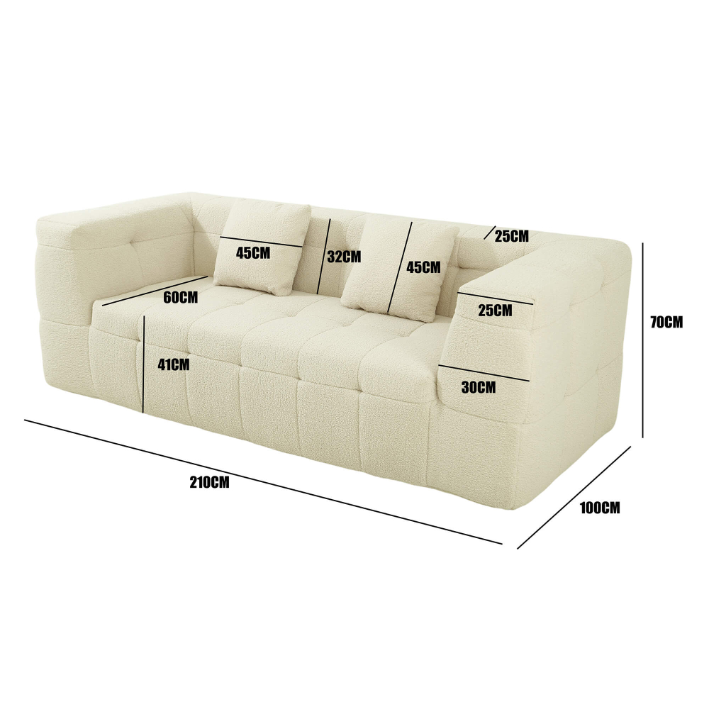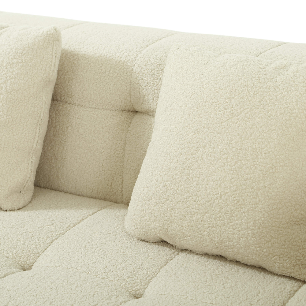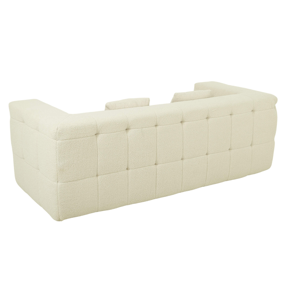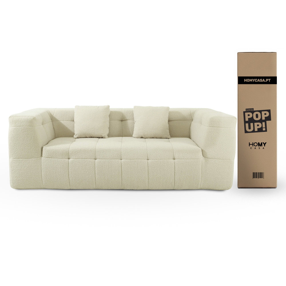 O enchimento em espuma de alta densidade (32 kg/m³) garante uma firmeza elevada, ideal para uso diário e para quem valoriza um assento estável e duradouro. O revestimento em tecido bouclé acrescenta textura, sofisticação e um toque acolhedor, seguindo as tendências mais fortes do design de interiores. As almofadas decorativas reforçam o conforto e equilibram o visual elegante do conjunto. Após a abertura da embalagem, o sofá recupera gradualmente a sua forma original, revelando linhas bem definidas, proporções equilibradas e um aspeto premium que prova que os sofás comprimidos são uma solução inteligente — e cheia de estilo.