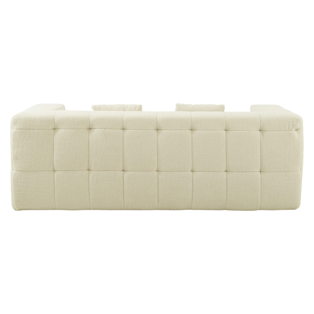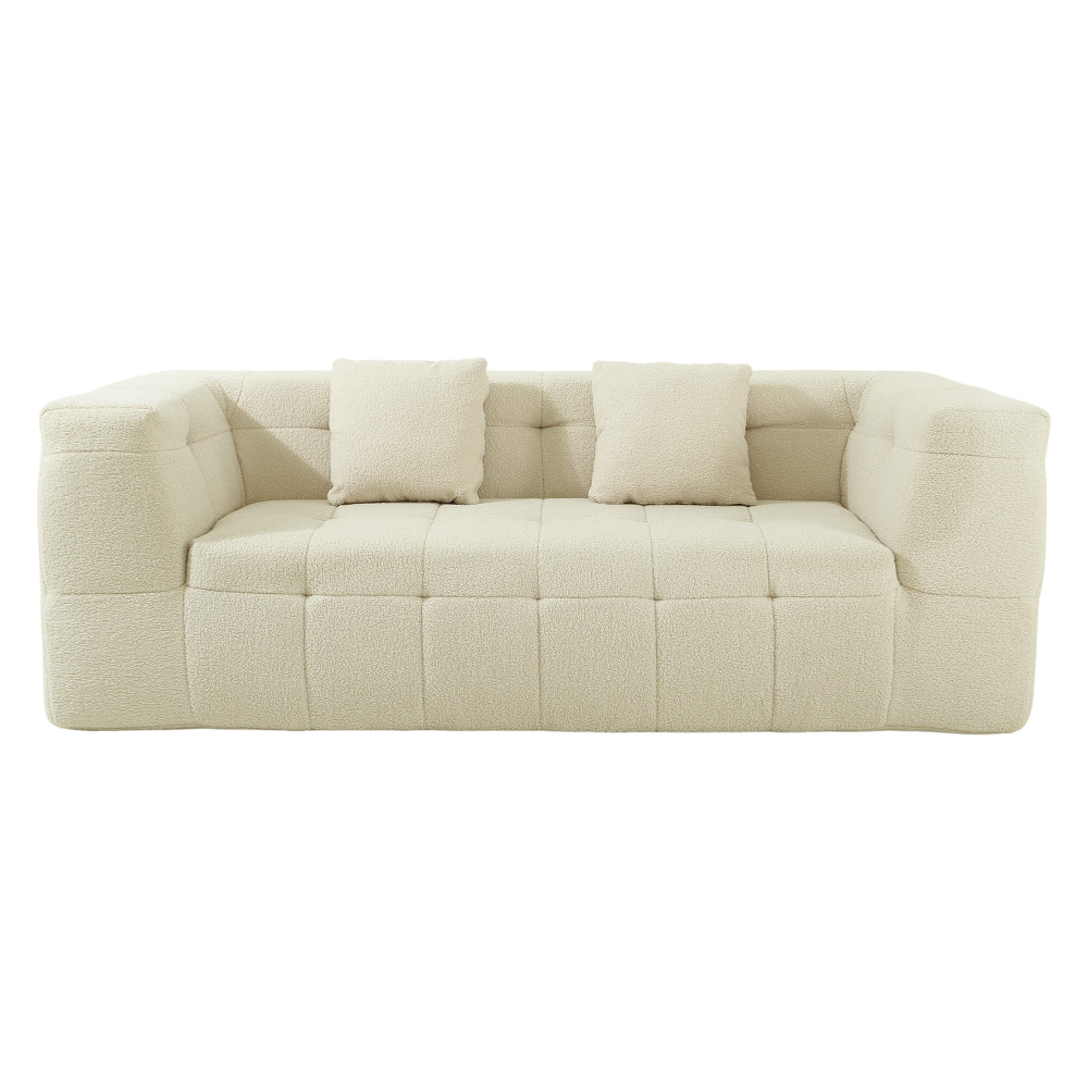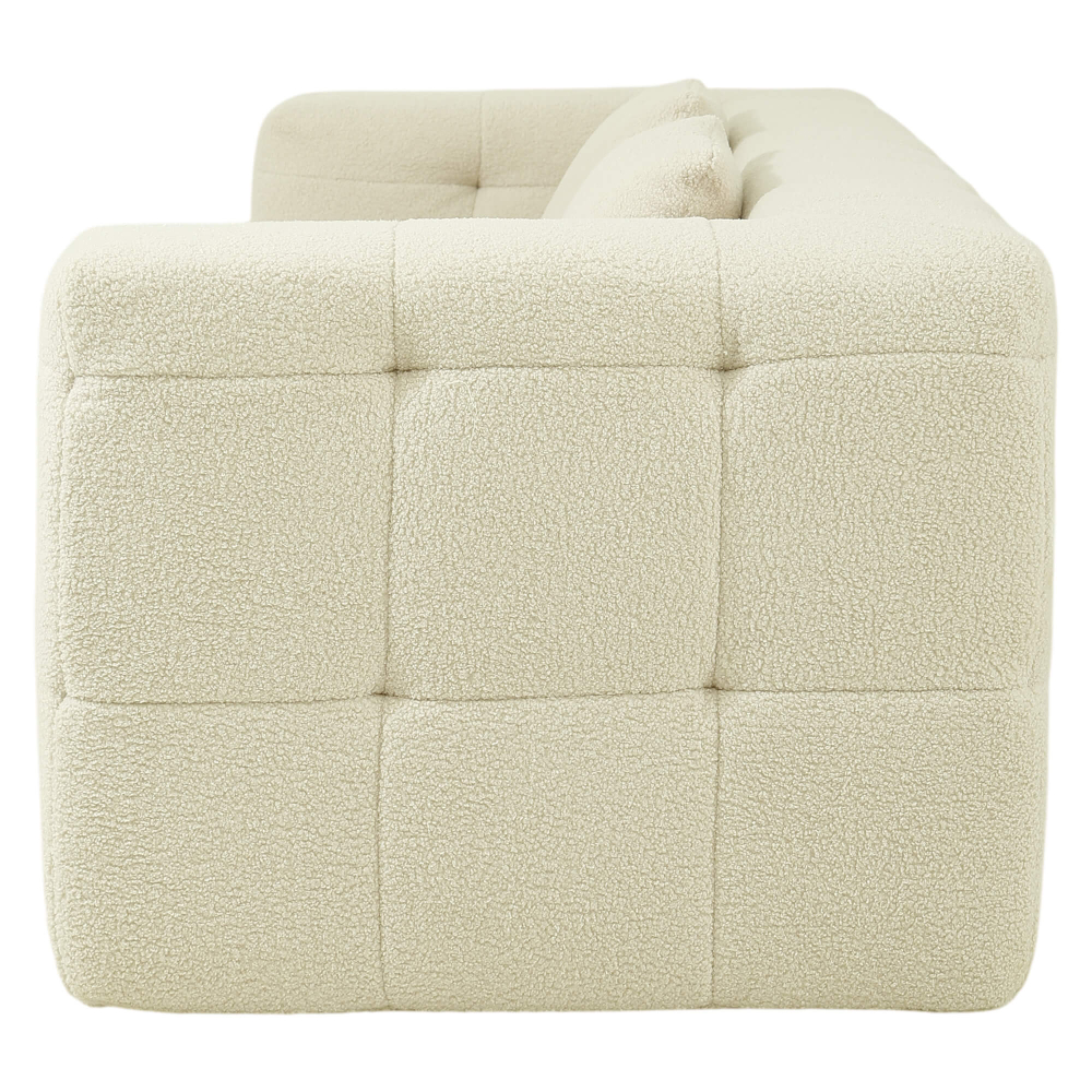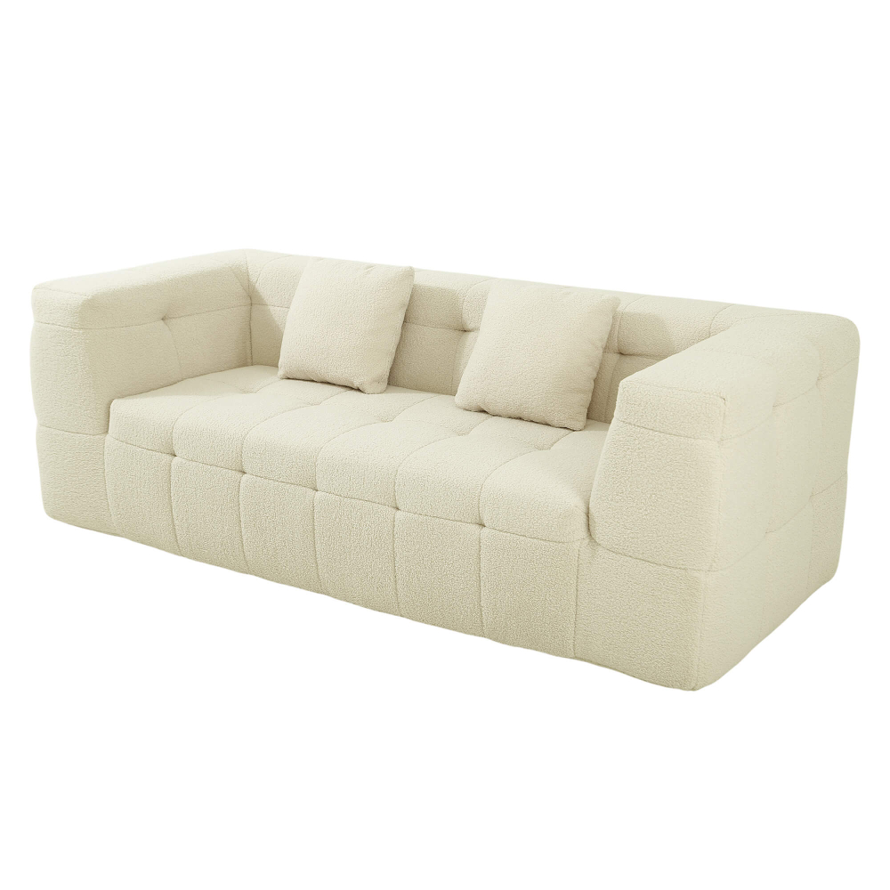 O enchimento em espuma de alta densidade (32 kg/m³) garante uma firmeza elevada, ideal para uso diário e para quem valoriza um assento estável e duradouro. O revestimento em tecido bouclé acrescenta textura, sofisticação e um toque acolhedor, seguindo as tendências mais fortes do design de interiores. As almofadas decorativas reforçam o conforto e equilibram o visual elegante do conjunto. Após a abertura da embalagem, o sofá recupera gradualmente a sua forma original, revelando linhas bem definidas, proporções equilibradas e um aspeto premium que prova que os sofás comprimidos são uma solução inteligente — e cheia de estilo.