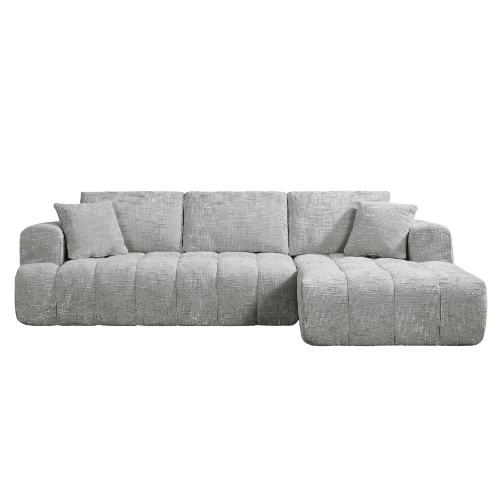 A estrutura aposta num enchimento em espuma de 30 kg/m³, garantindo firmeza alta e excelente suporte corporal. O tecido texturizado acrescenta profundidade visual e resistência ao uso, enquanto a chaise longue integrada convida ao descanso prolongado.