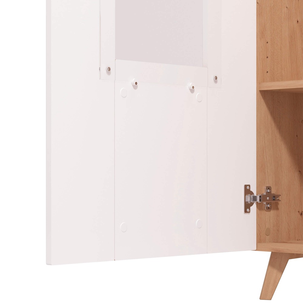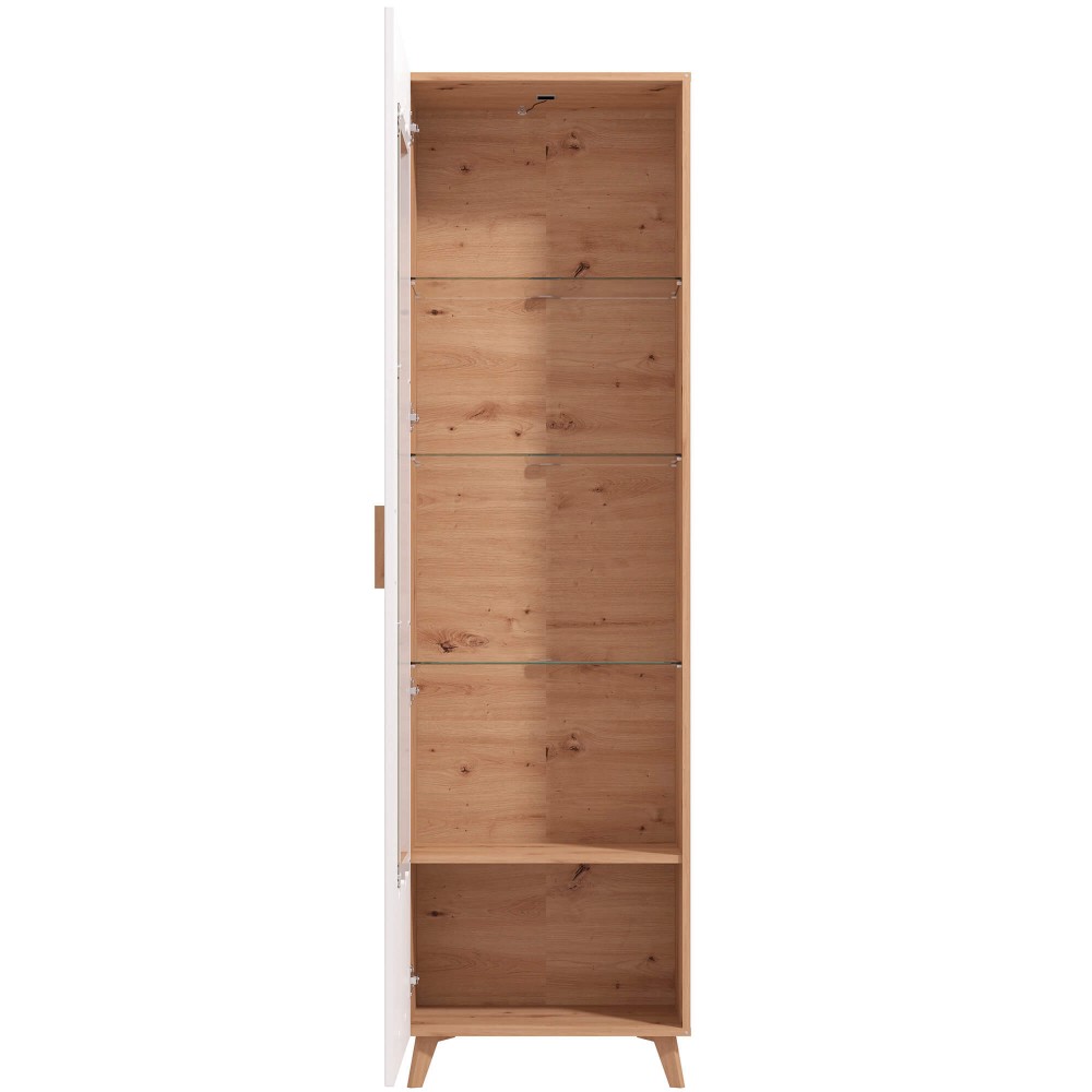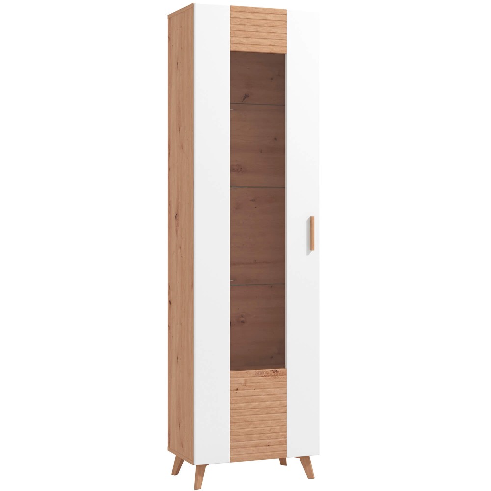 Esta vitrine é perfeita para quem procura um móvel elegante e funcional, capaz de valorizar loiças, copos ou objetos decorativos. A combinação entre o branco lacado e os detalhes em madeira cria um ambiente equilibrado e acolhedor, enquanto as prateleiras em vidro garantem leveza visual e destaque ao conteúdo exposto. A estrutura alta e estreita permite uma excelente otimização do espaço, mesmo em divisões mais compactas.