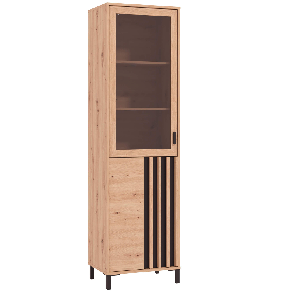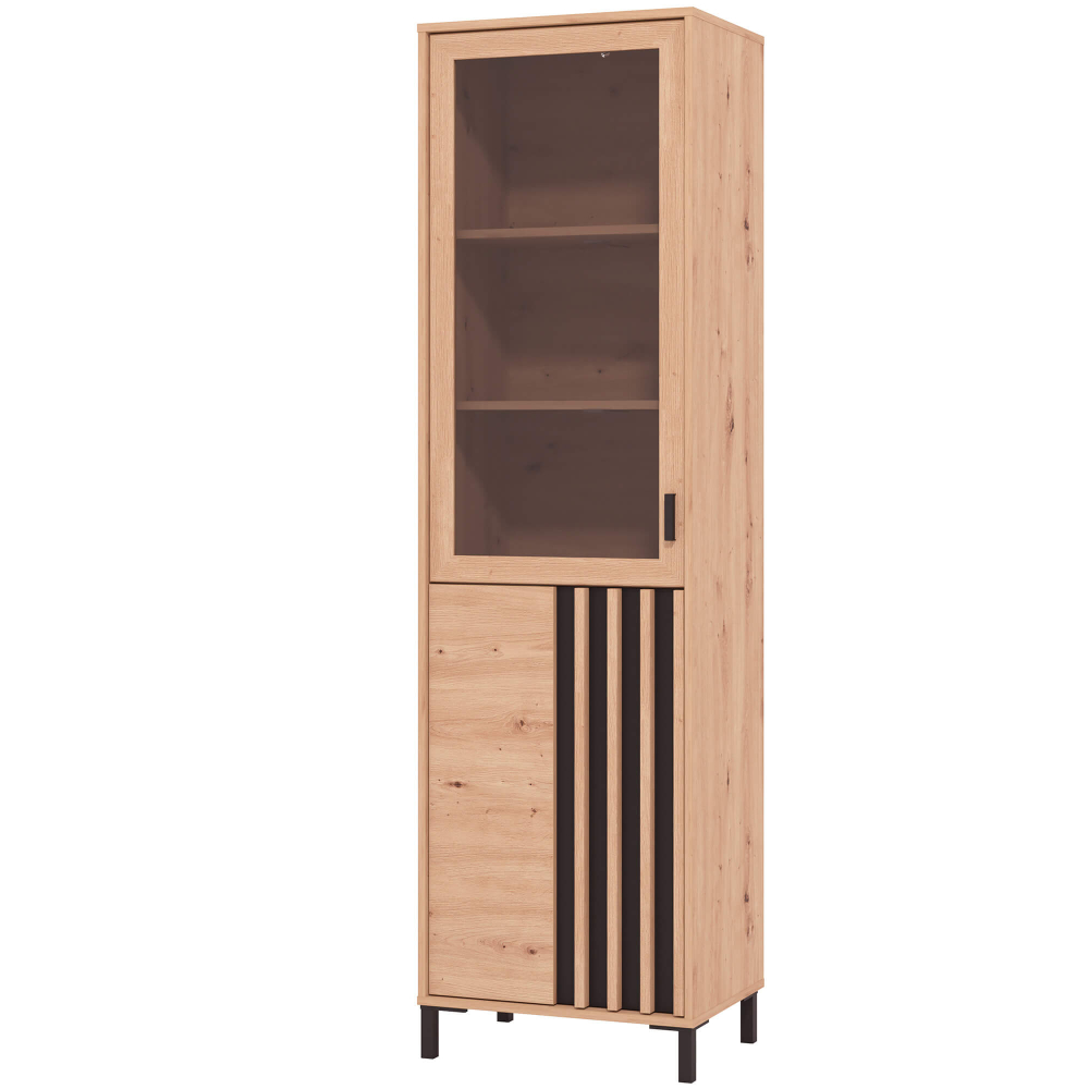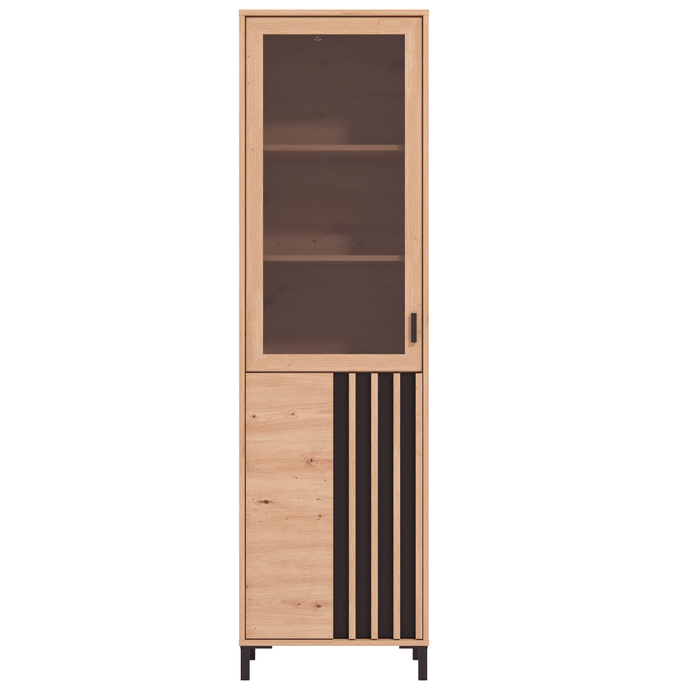 Esta peça mistura materiais modernos e acabamentos contrastantes para criar uma presença marcante. A porta em vidro permite exibir os seus objetos favoritos, enquanto a porta ripada confere um toque gráfico e elegante. Os pés elevados facilitam a limpeza por baixo e contribuem para a leveza do design.