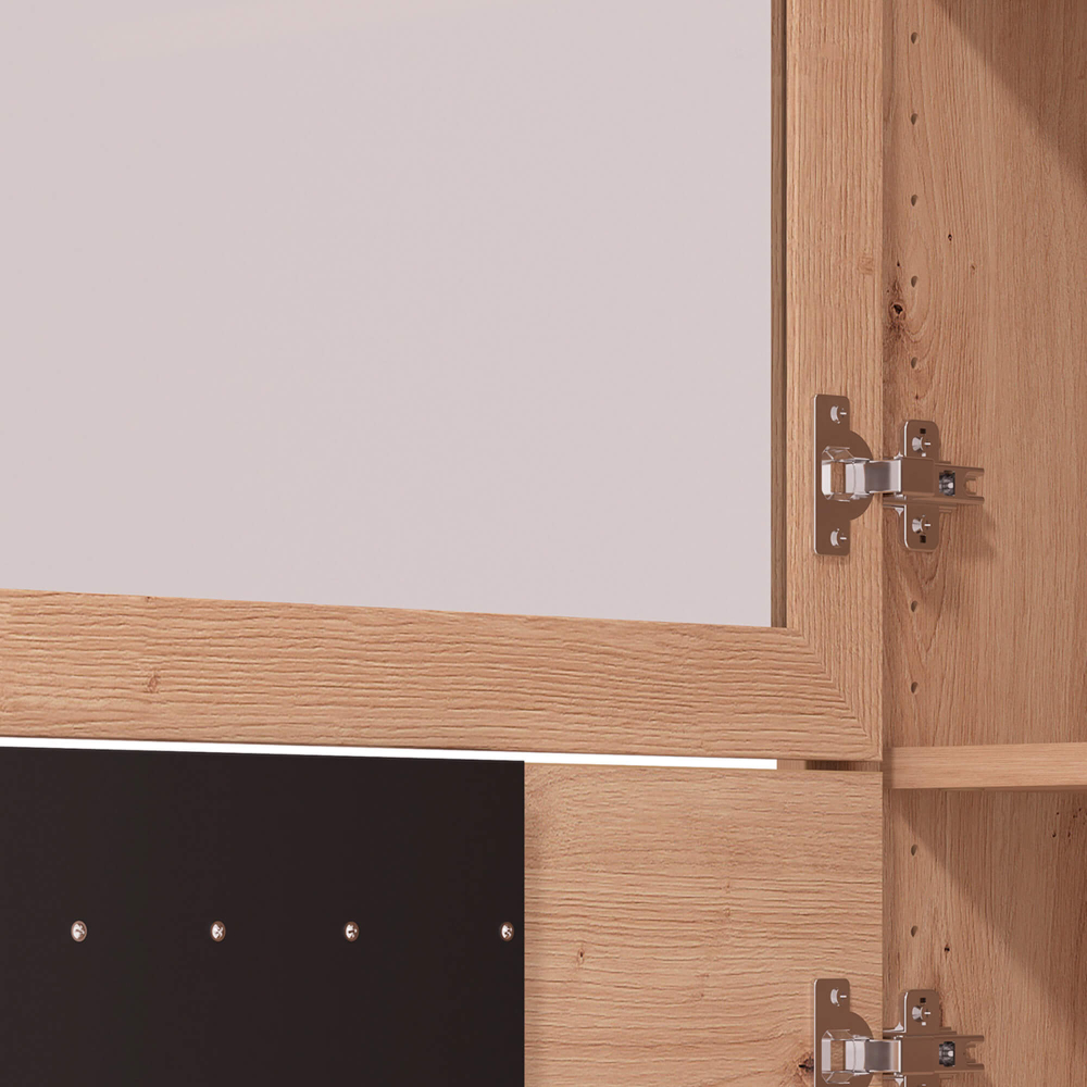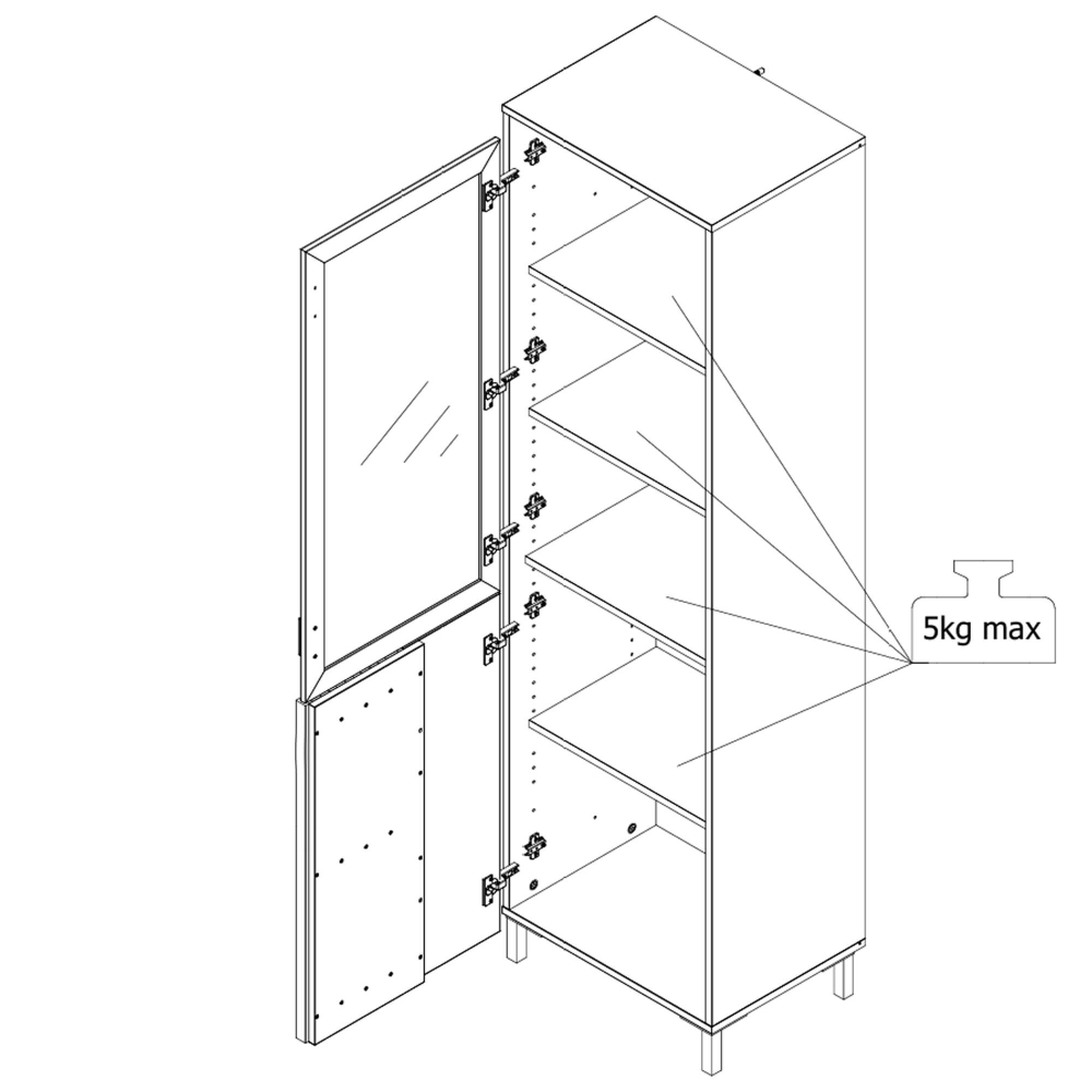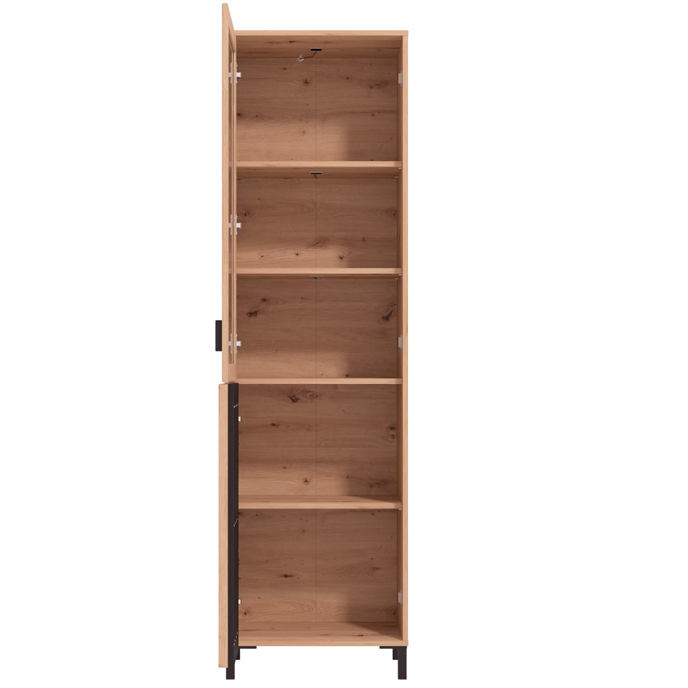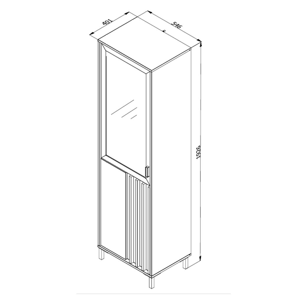 Esta peça mistura materiais modernos e acabamentos contrastantes para criar uma presença marcante. A porta em vidro permite exibir os seus objetos favoritos, enquanto a porta ripada confere um toque gráfico e elegante. Os pés elevados facilitam a limpeza por baixo e contribuem para a leveza do design.