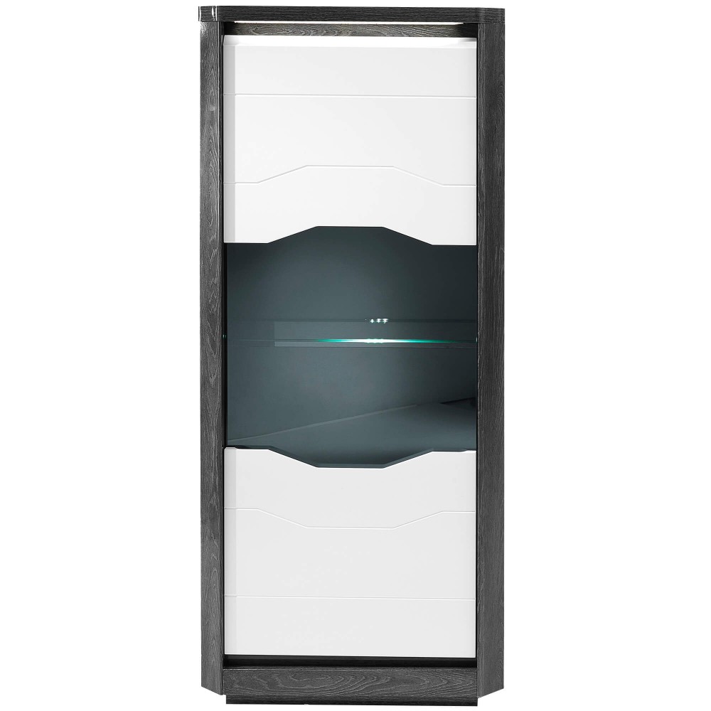 Esta vitrine é uma peça forte em termos visuais e extremamente funcional. A iluminação LED valoriza objetos decorativos, loiças ou peças de destaque, criando um efeito elegante e contemporâneo. O contraste entre o branco brilhante das portas e o interior escuro transmite sofisticação, enquanto a arrumação vertical otimiza o espaço disponível. Ideal para salas de estar ou salas de jantar que pedem um móvel com presença, mas sem excessos.