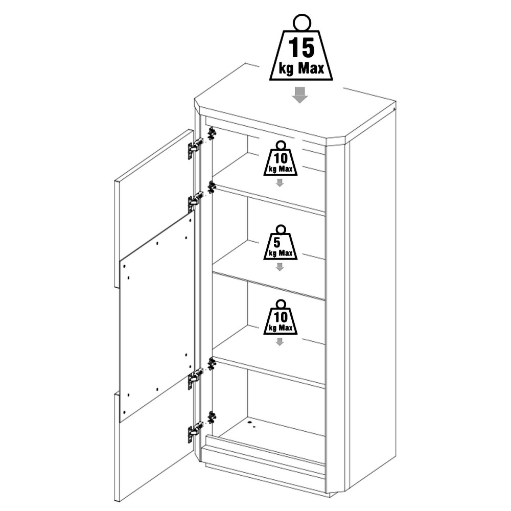 A Vitrine MATERA com LED e 1 porta apresenta uma estrutura em painel de partículas, portas com 22 mm de espessura e fecho suave retardador, garantindo um manuseamento confortável e silencioso. O revestimento em folha de melamina assegura resistência diária, enquanto o acabamento lacado branco brilhante nas portas reforça o visual moderno. Inclui 3 prateleiras, sendo 1 em vidro com 10 mm de espessura, e iluminação LED integrada com ligação por cabo elétrico. Para segurança e correta montagem, é obrigatória a fixação à parede e a montagem com o móvel deitado no chão.