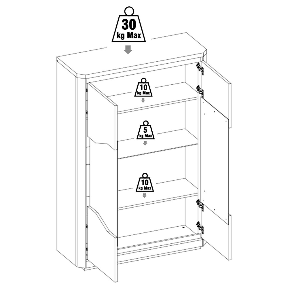 A Vitrine MATERA com LED e 2 portas apresenta uma estrutura em painel de partículas, com revestimento em folha de melamina e portas de 22 mm de espessura com acabamento lacado a branco brilhante. Integra duas portas de bater com sistema de fecho suave retardador, três prateleiras interiores — uma delas em vidro temperado com 10 mm de espessura — e iluminação LED integrada com ligação por cabo elétrico. O tampo superior suporta até 30 kg, as prateleiras em aglomerado até 10 kg e a prateleira em vidro até 5 kg. Para segurança, é obrigatória a fixação à parede, sendo também necessário deitar o artigo no chão para concluir corretamente a montagem. Fabrico 100% italiano.