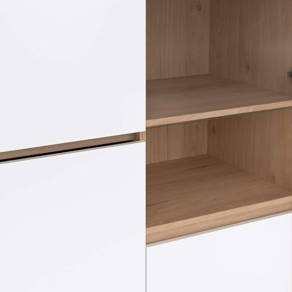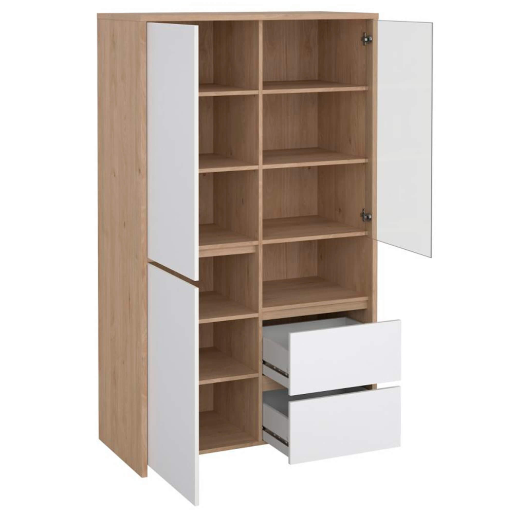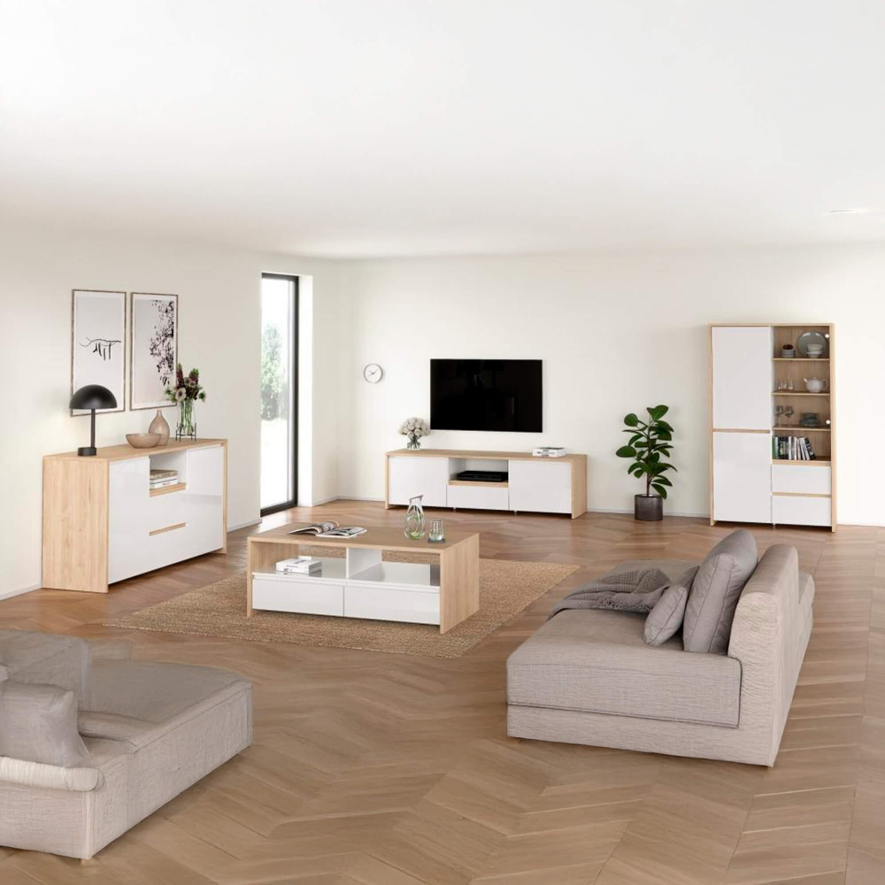 Vitrine NEXT com 3 portas e 2 gavetas em branco brilhante e madeira clara.