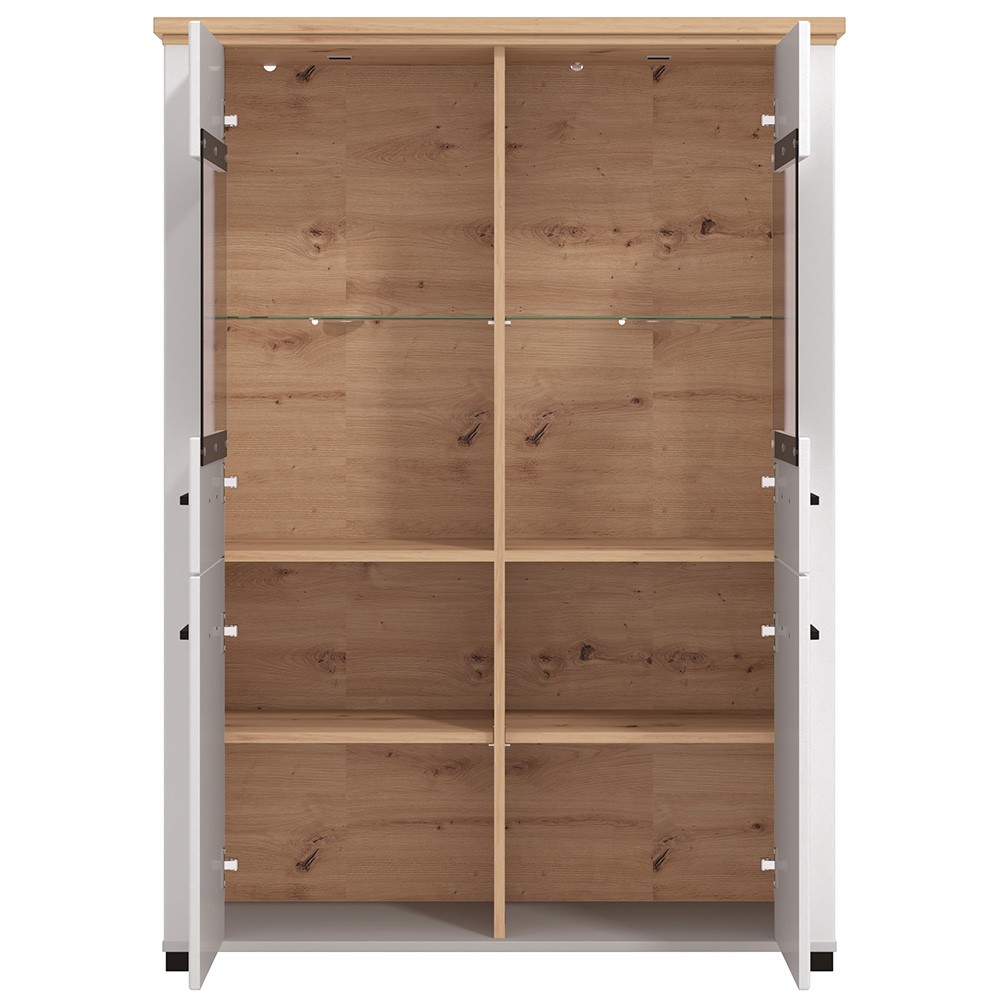 Esta vitrine combina funcionalidade e estética de forma exemplar. As portas com vidro permitem destacar peças decorativas, louça ou livros, enquanto as prateleiras fechadas mantêm tudo organizado e protegido. O acabamento mate confere um aspeto sofisticado e discreto, fácil de integrar em salas de estar ou salas de jantar. Uma escolha segura para quem procura arrumação prática sem abdicar de estilo.